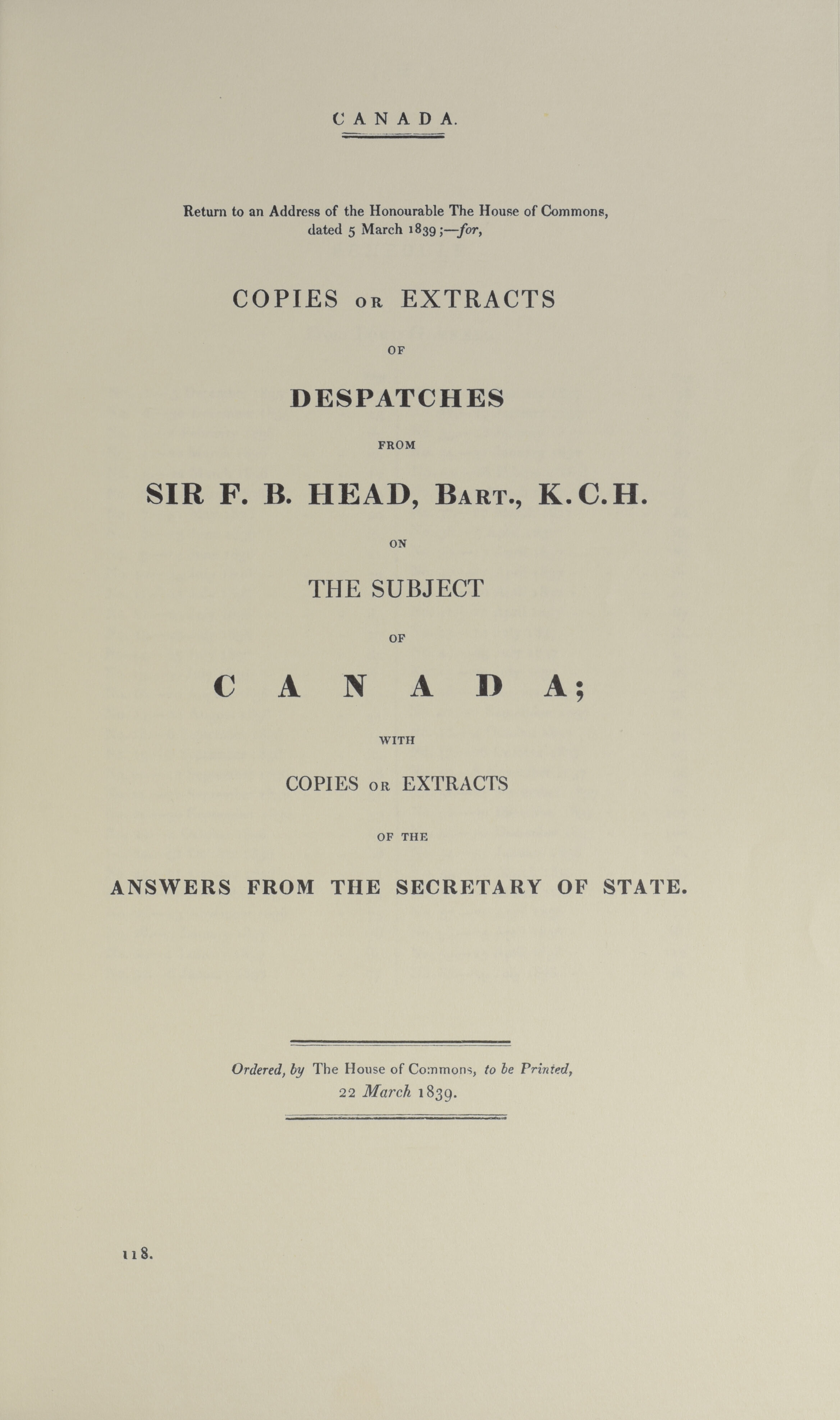 Despatches from Sir F B Head relating to Canada, with answers from the Secretary of State, 1839