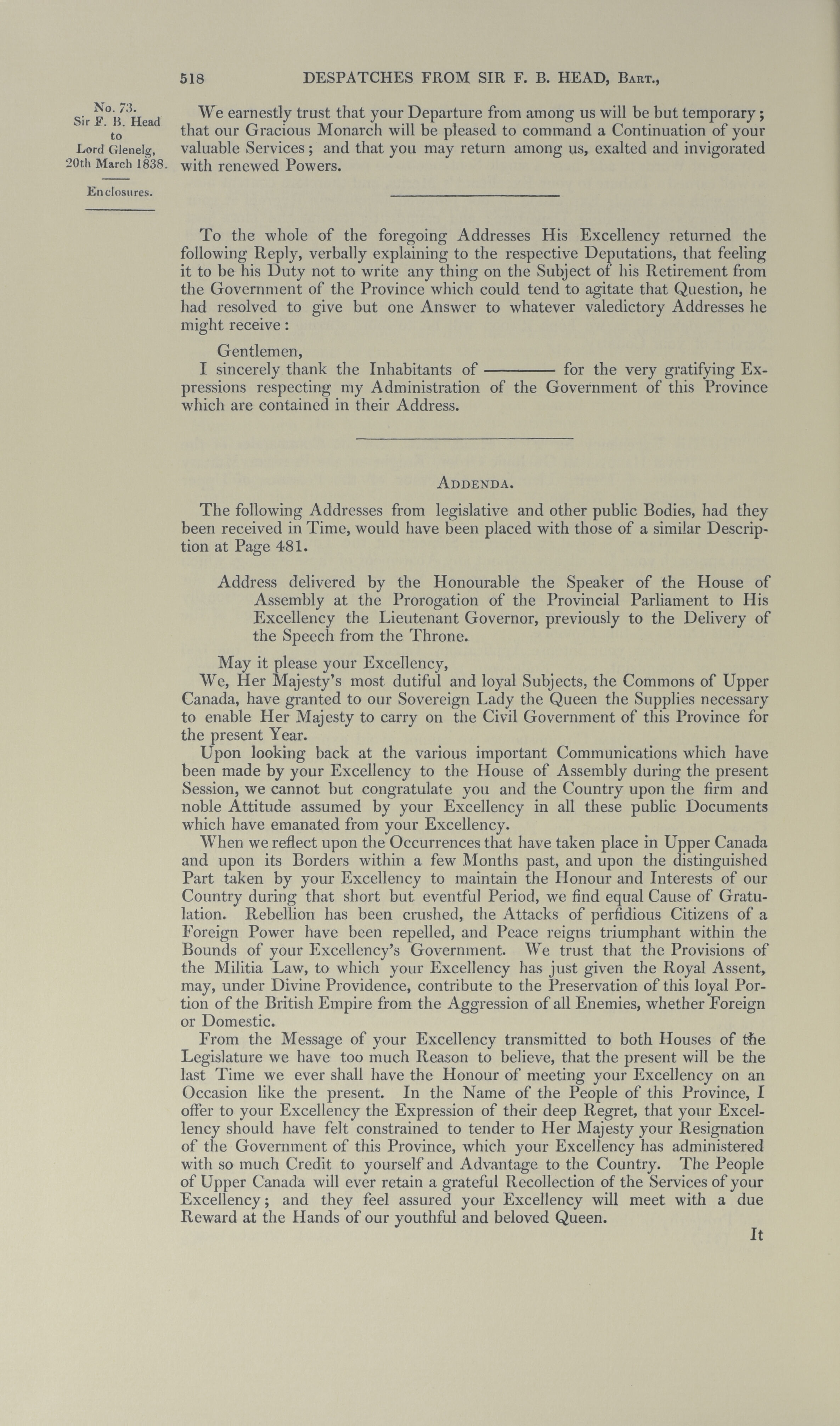 Irish University Press series of British parliamentary papers : despatches from Sir F B Head relating to Canada, with answers from the Secretary of State, 1839