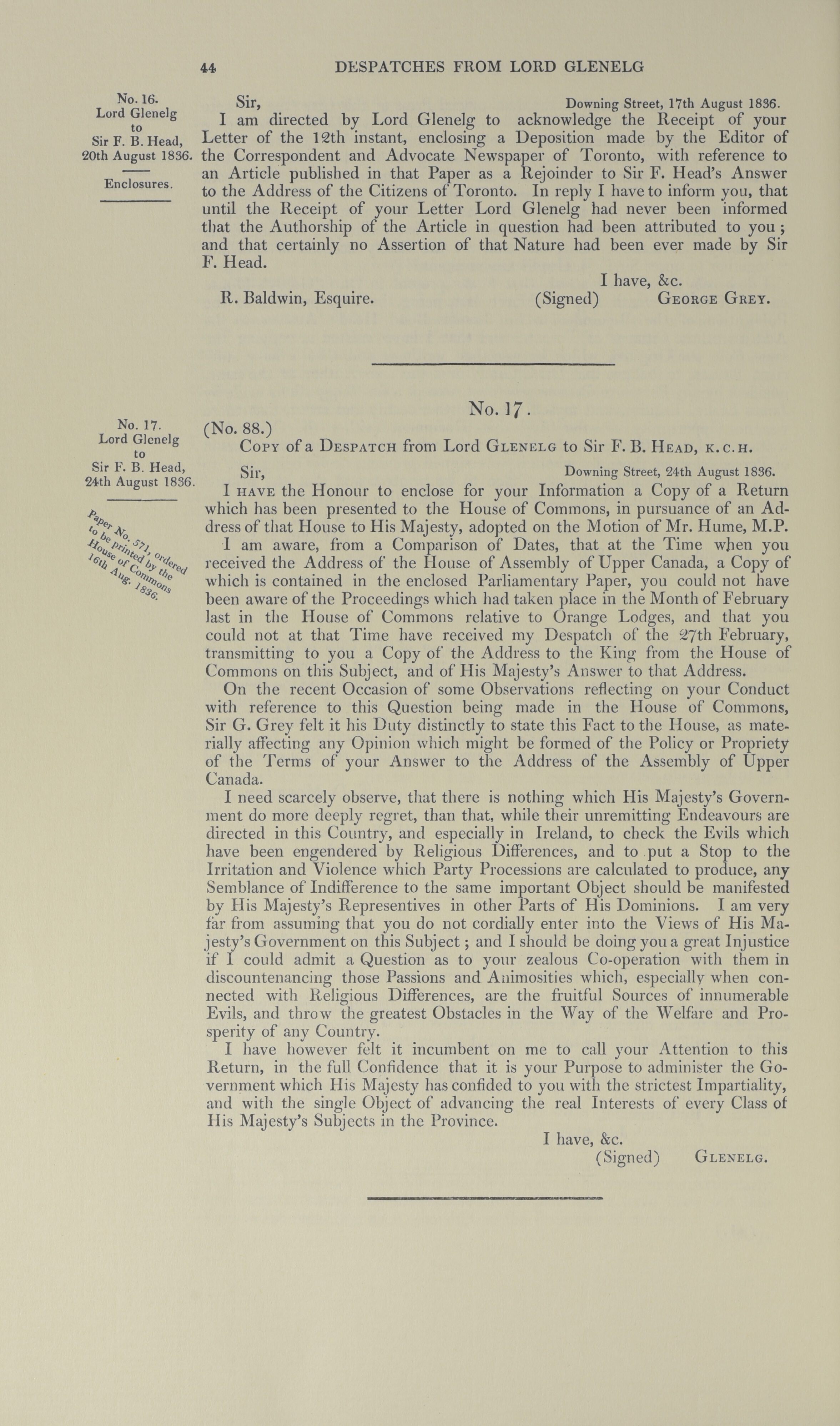 Despatches from Sir F B Head relating to Canada, with answers from the Secretary of State, 1839