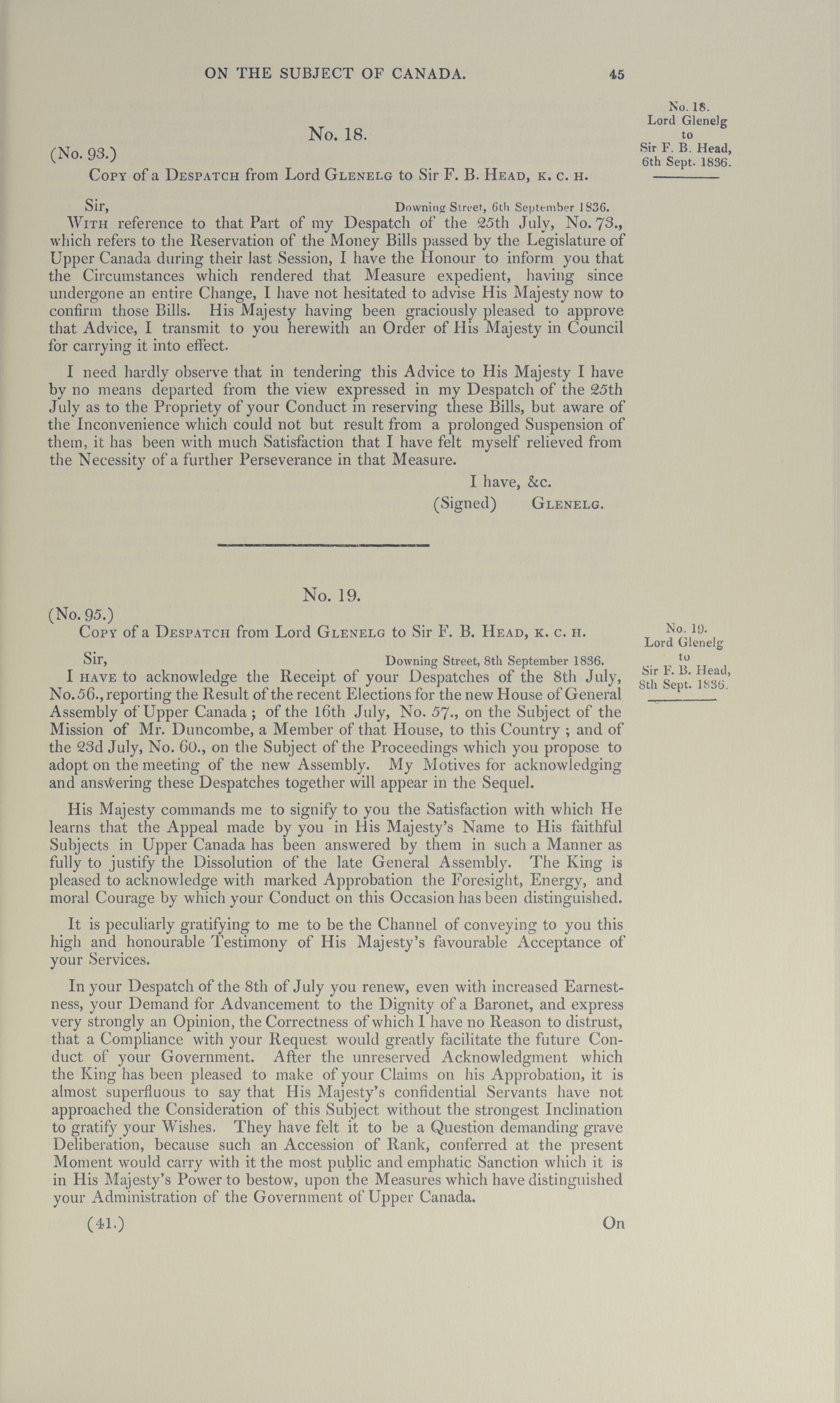 Despatches from Sir F B Head relating to Canada, with answers from the Secretary of State, 1839