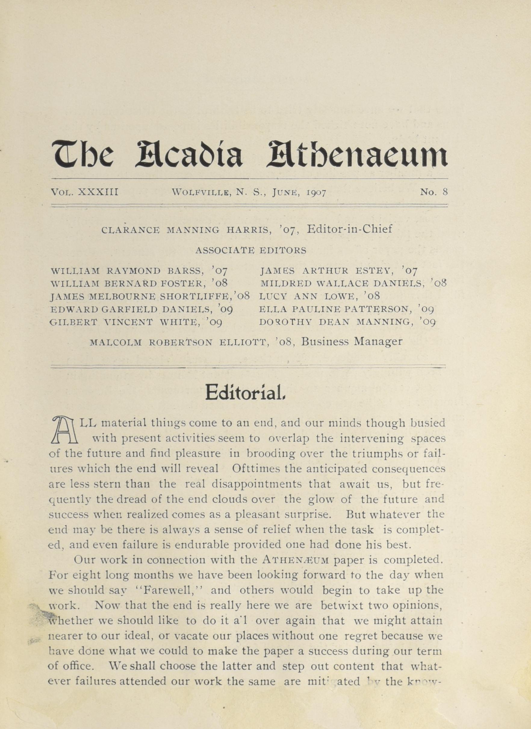 - The Acadia athenaeum : Vol. XXXIII, No. 8 (June 1907)