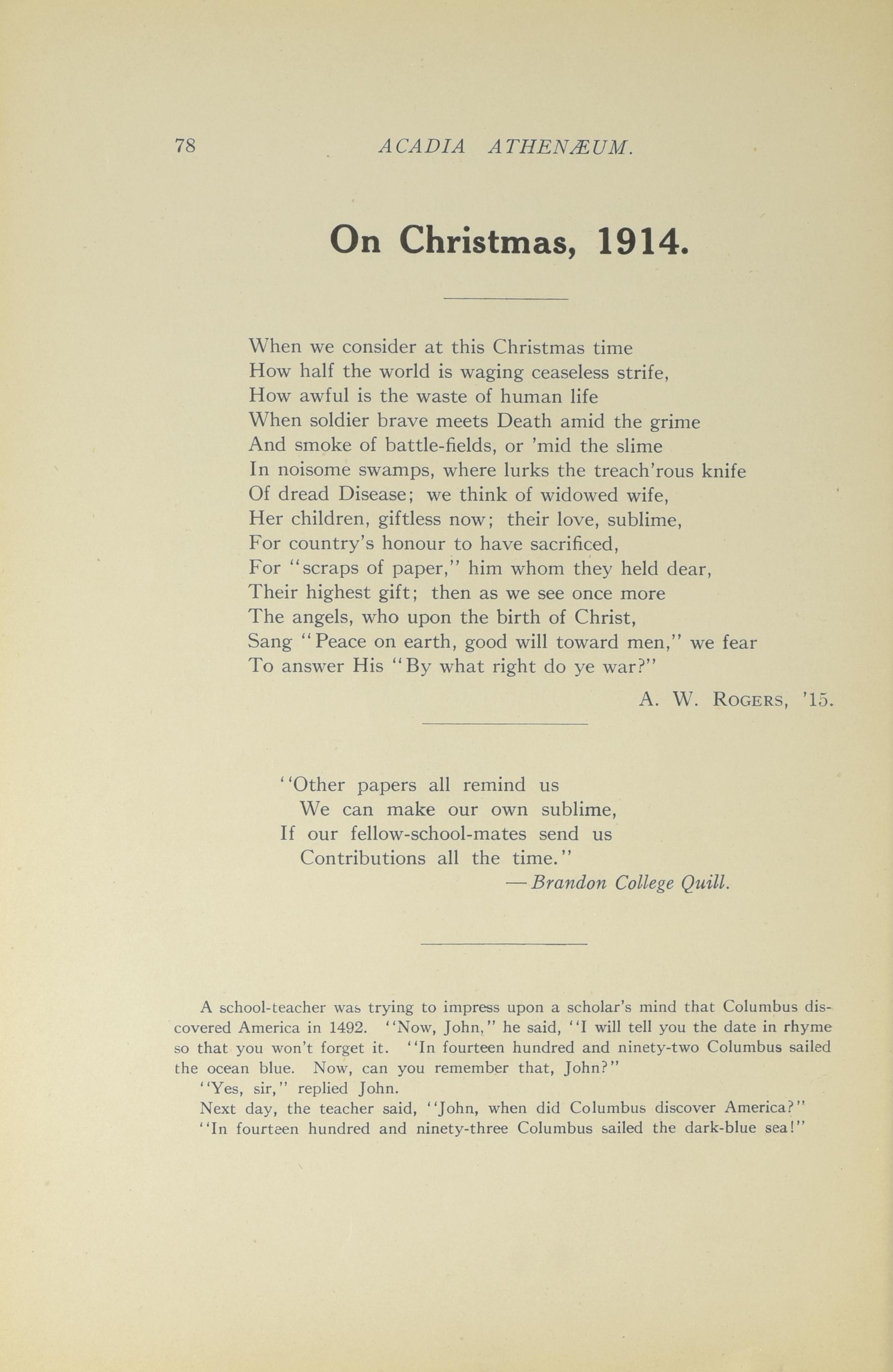 - [Wolfville, N.S.]: [Published by the Athenaeum Society of Acadia University], [1914]