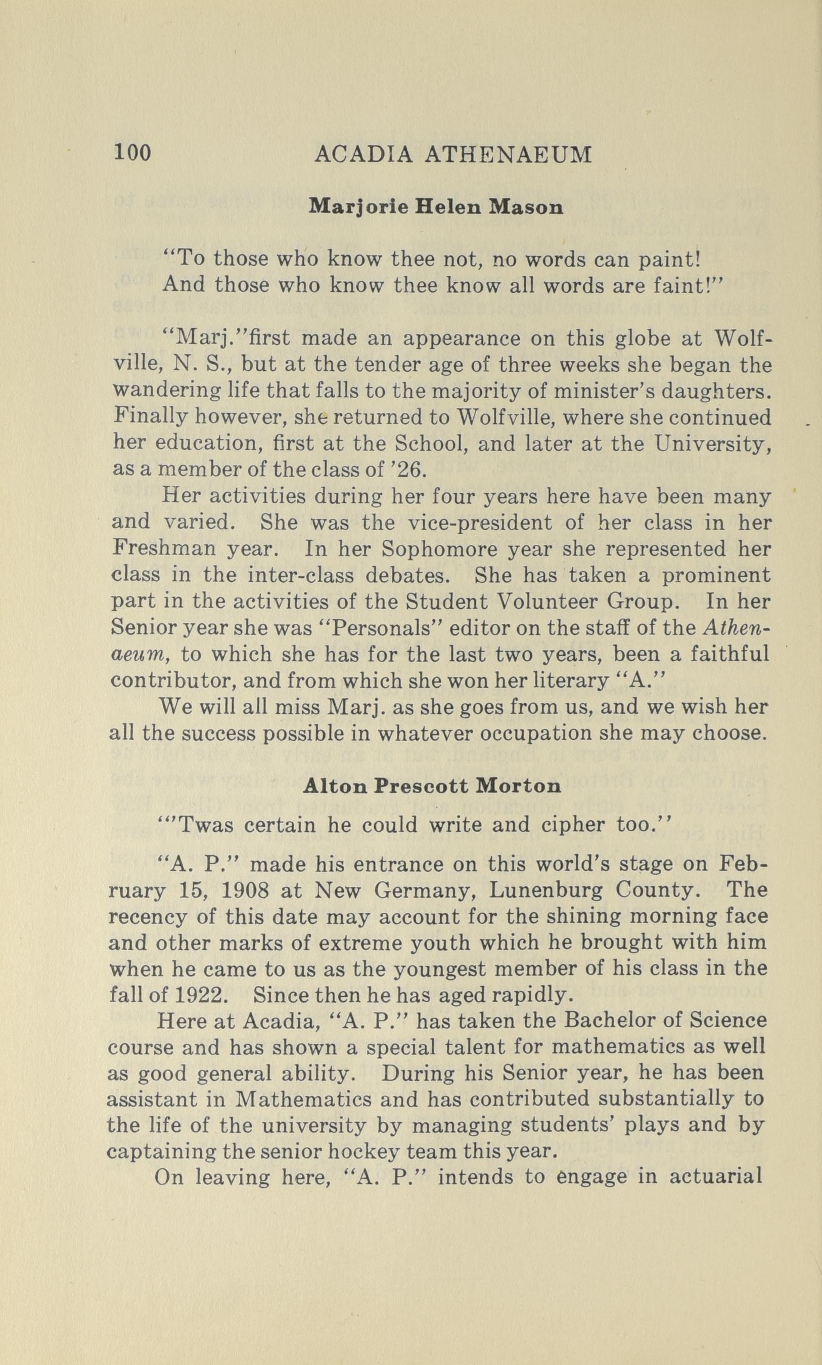 - Wolfville, N.S.: [Published by the Athenaeum Society of Acadia University], [1926]