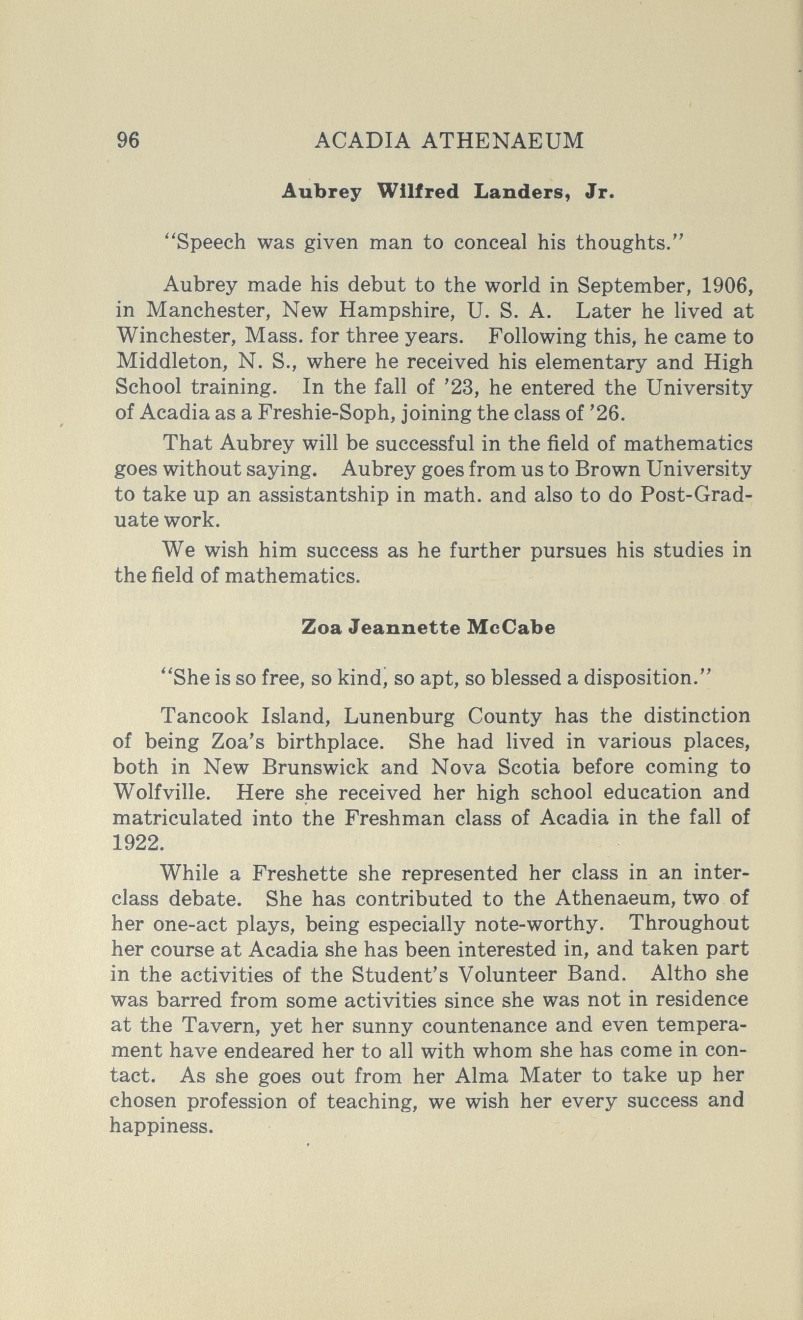 - Wolfville, N.S.: [Published by the Athenaeum Society of Acadia University], [1926]