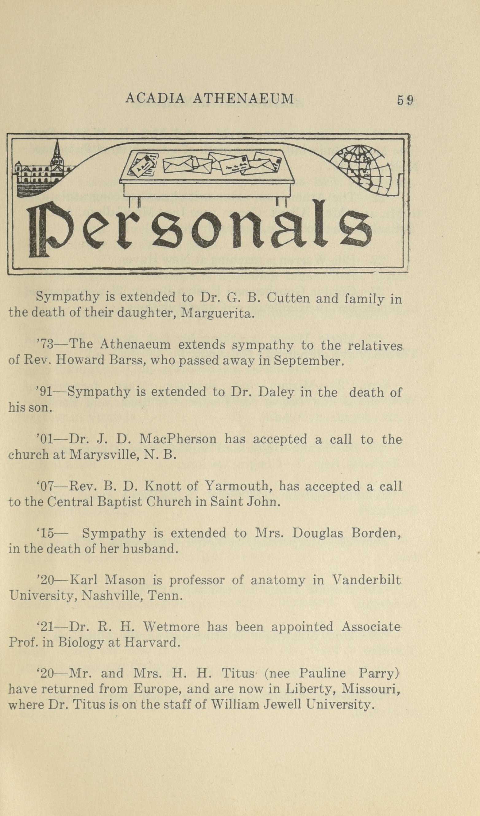 - Wolfville, N.S.: [Published by the Athenaeum Society of Acadia University], [1926]