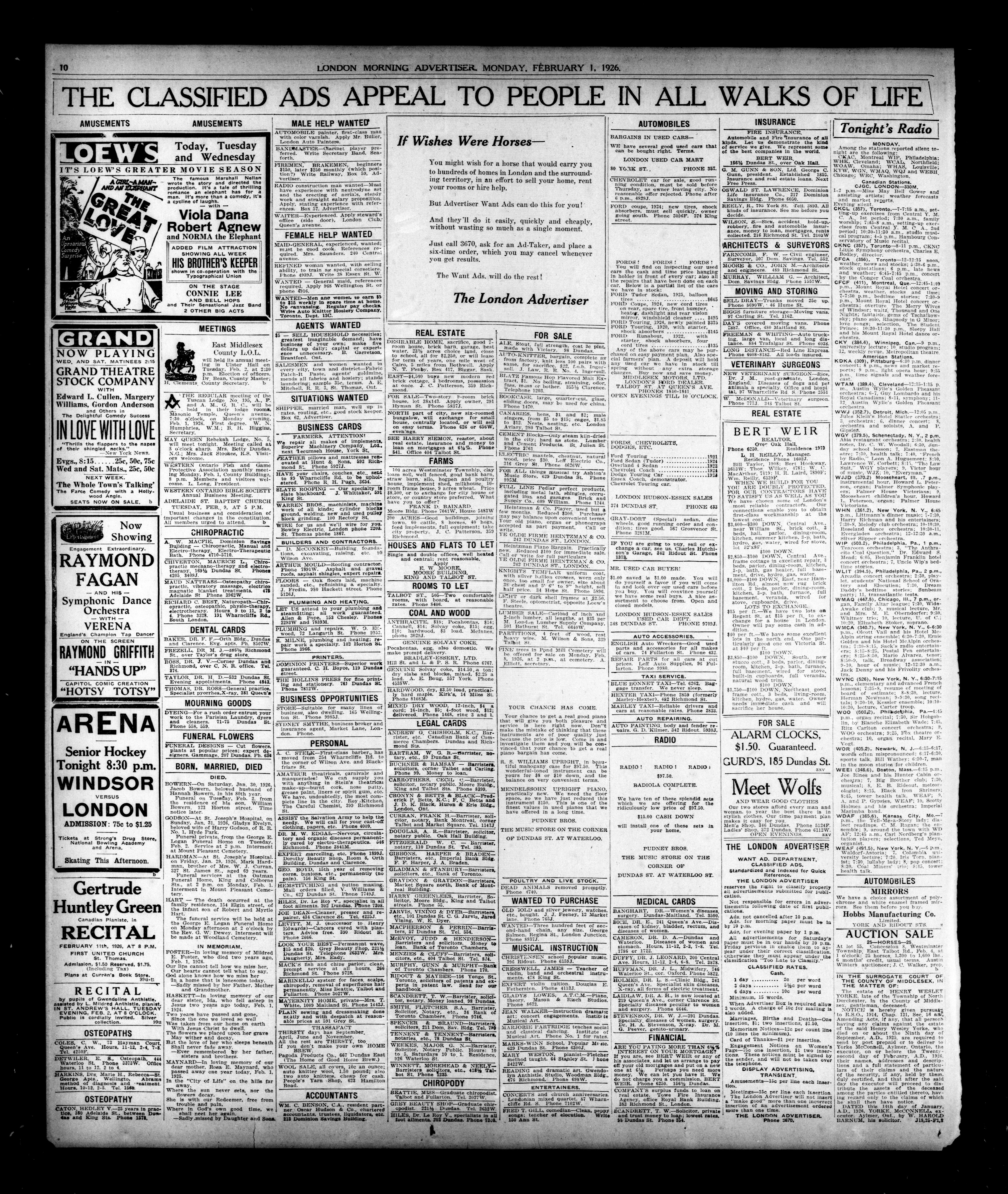 London, Ontario : London Advertiser Company, Limited, [1926]; 12 images, 0 with full-text search