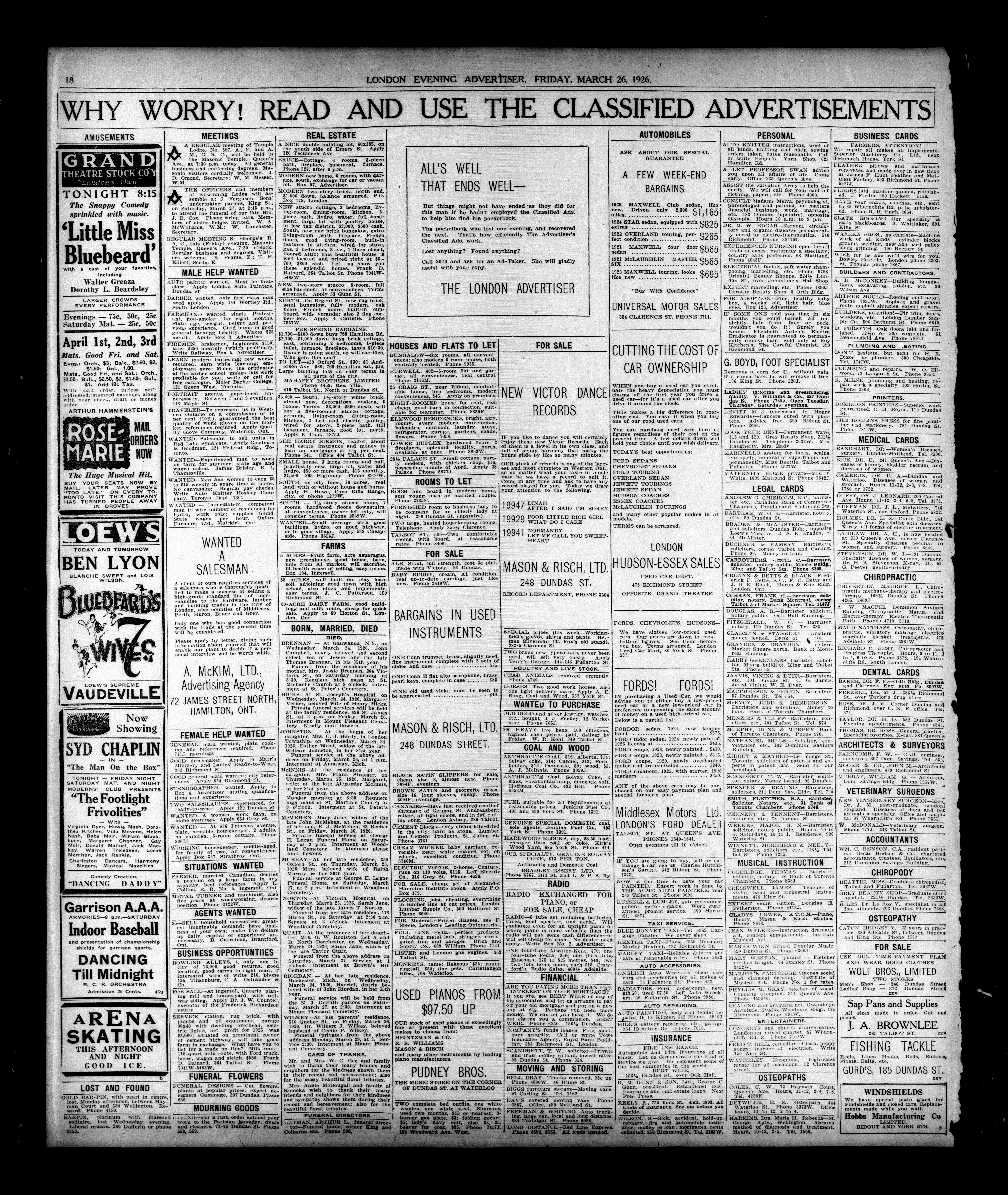 Aide London, Ontario : London Advertiser Company, Limited, [1926]; 20 images, 0 avec recherche en texte intégral