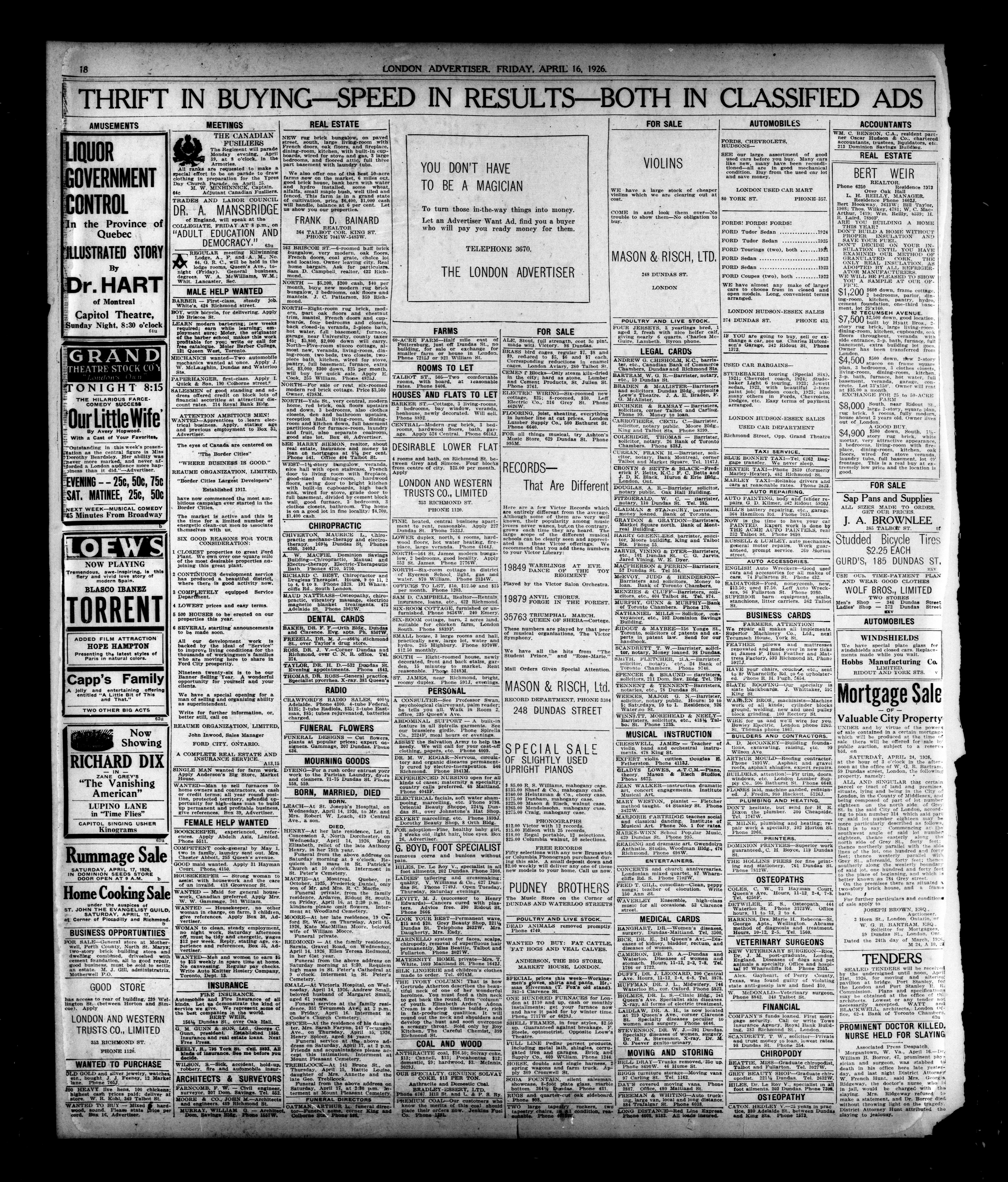London, Ontario : London Advertiser Company, Limited, [1926]; 20 images, 0 with full-text search