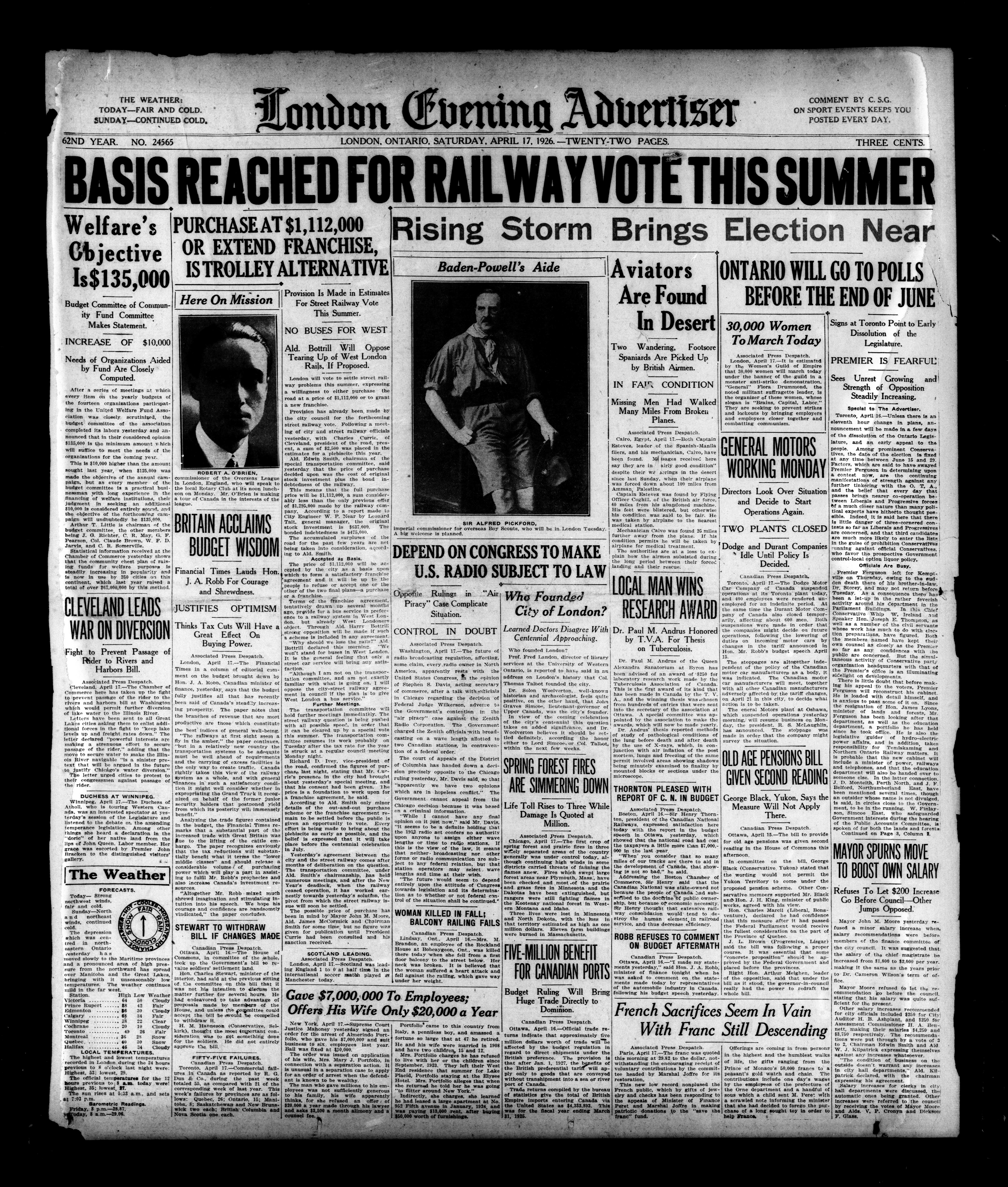 London, Ontario : London Advertiser Company, Limited, [1926]; 22 images, 0 avec recherche en texte intégral