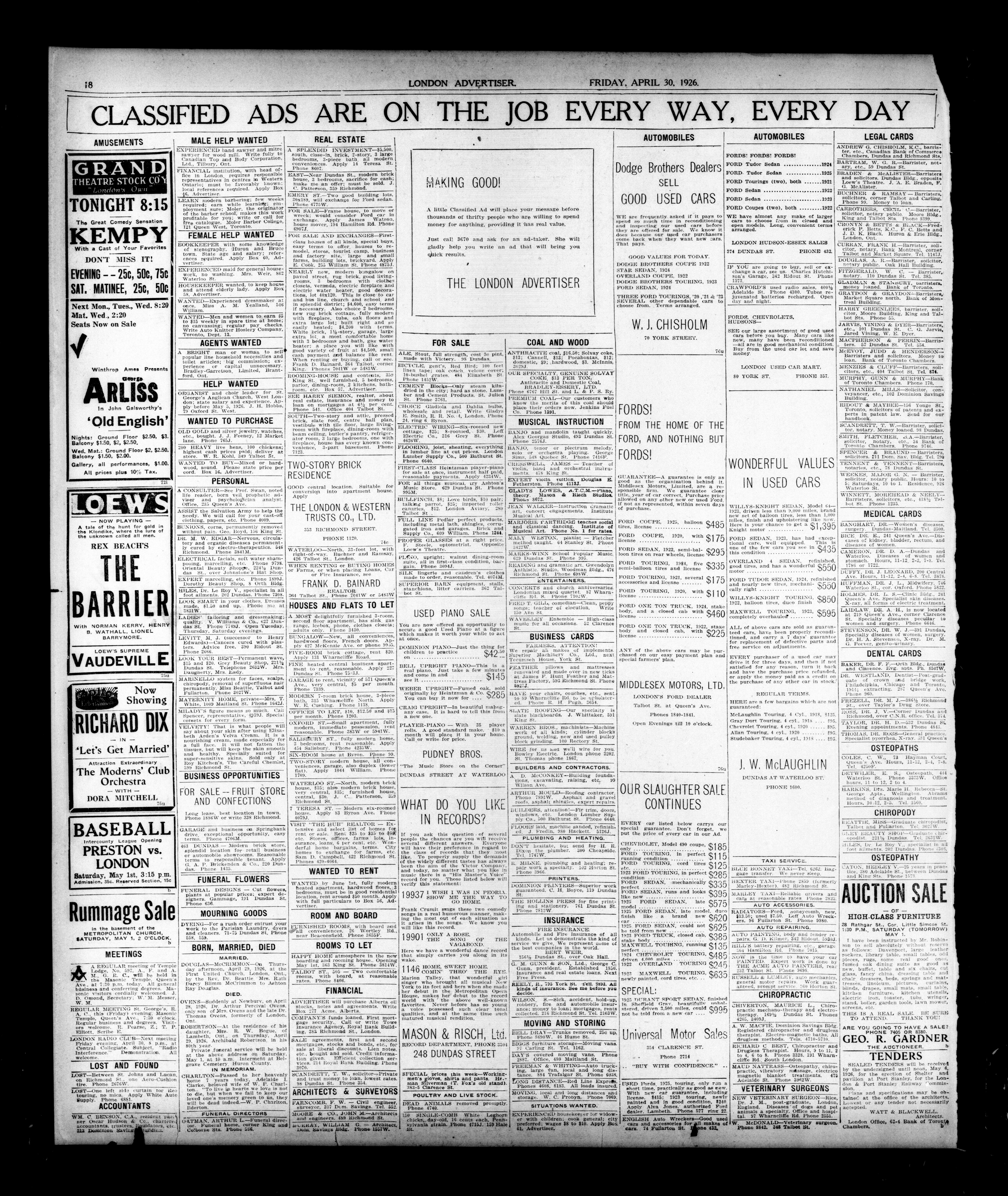 London, Ontario : London Advertiser Company, Limited, [1926]; 20 images, 0 avec recherche en texte intégral