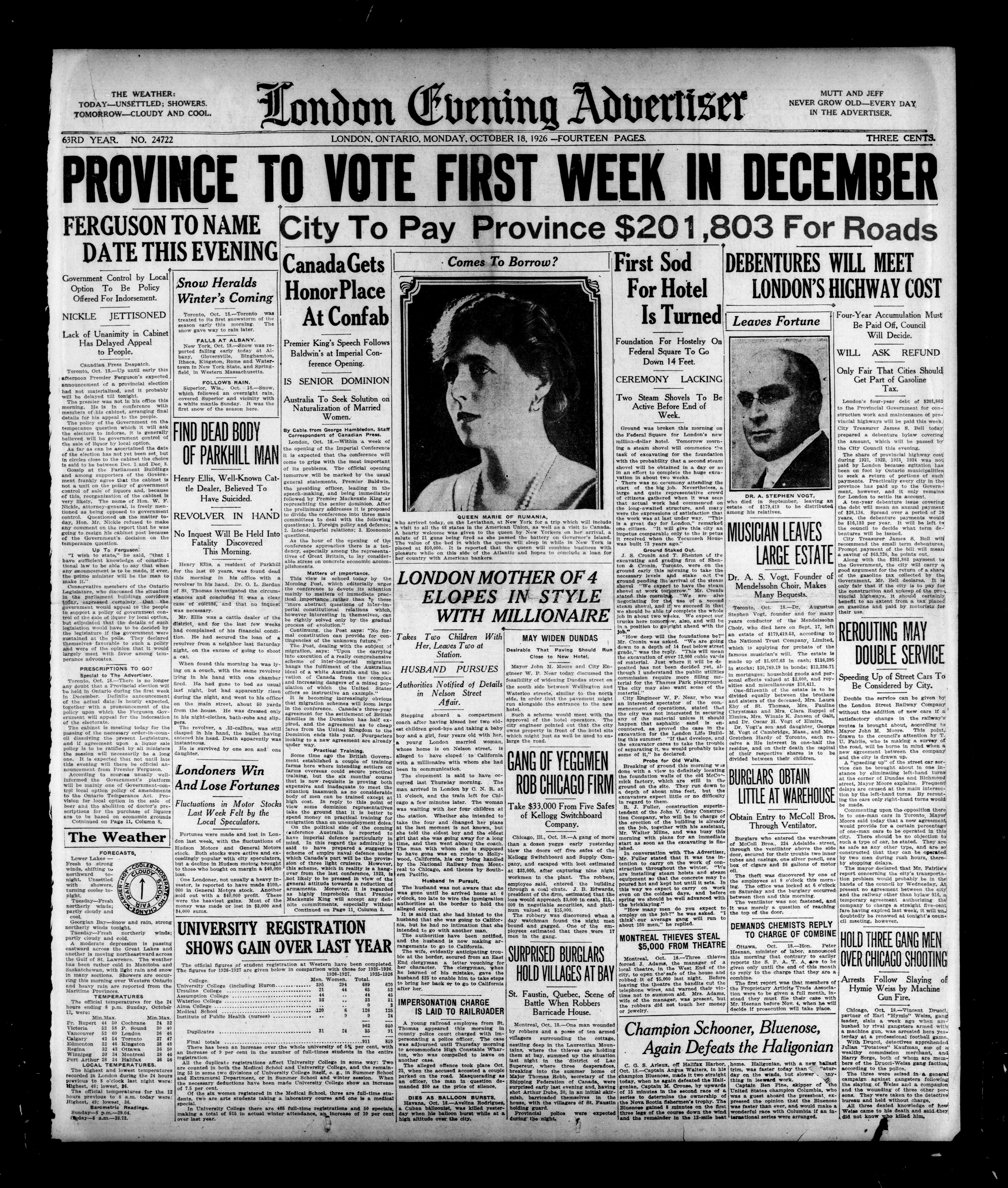 London, Ontario : London Advertiser Company, Limited, [1926]; 14 images, 0 avec recherche en texte intégral
