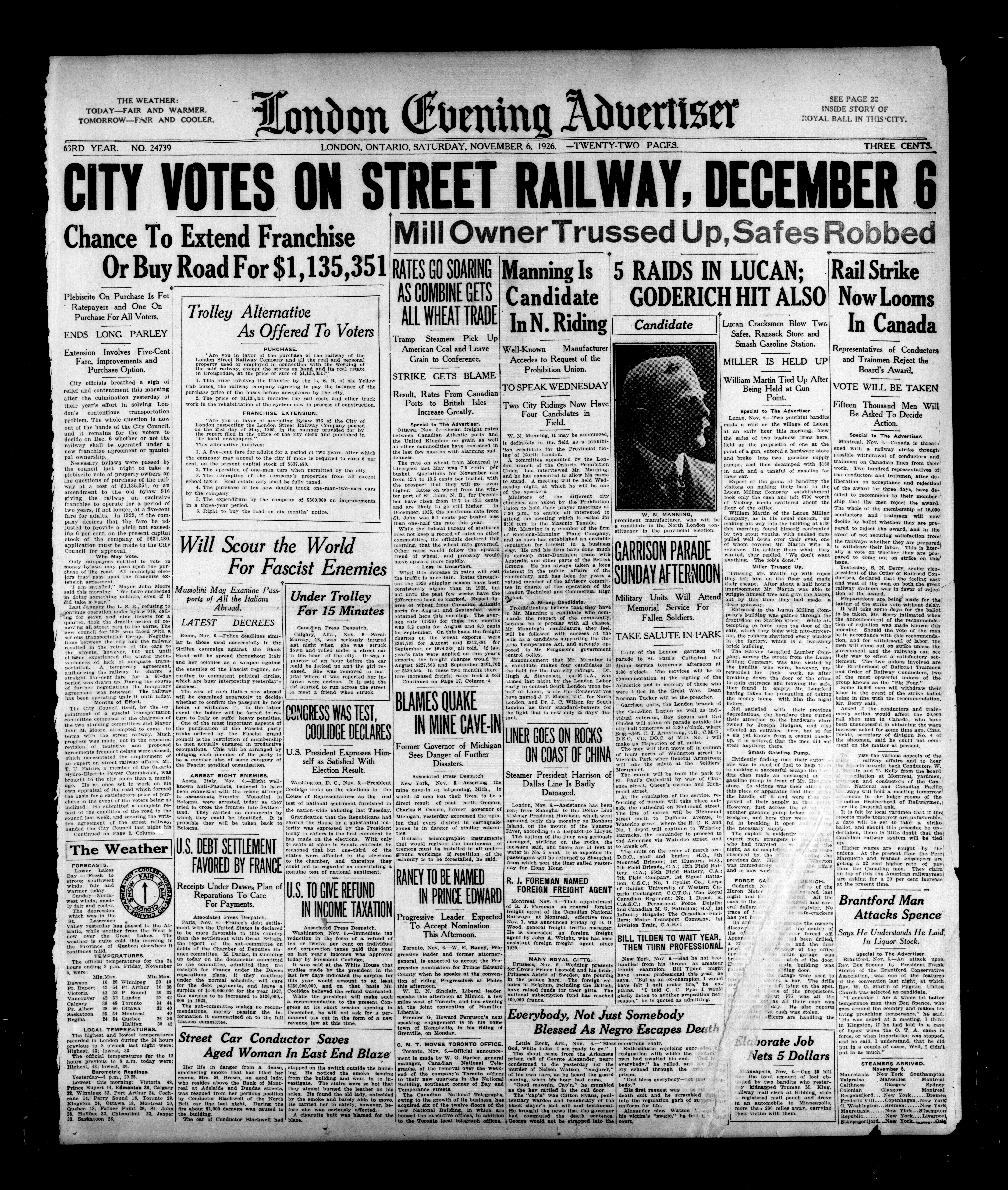 London, Ontario : London Advertiser Company, Limited, [1926]; 22 images, 0 avec recherche en texte intégral