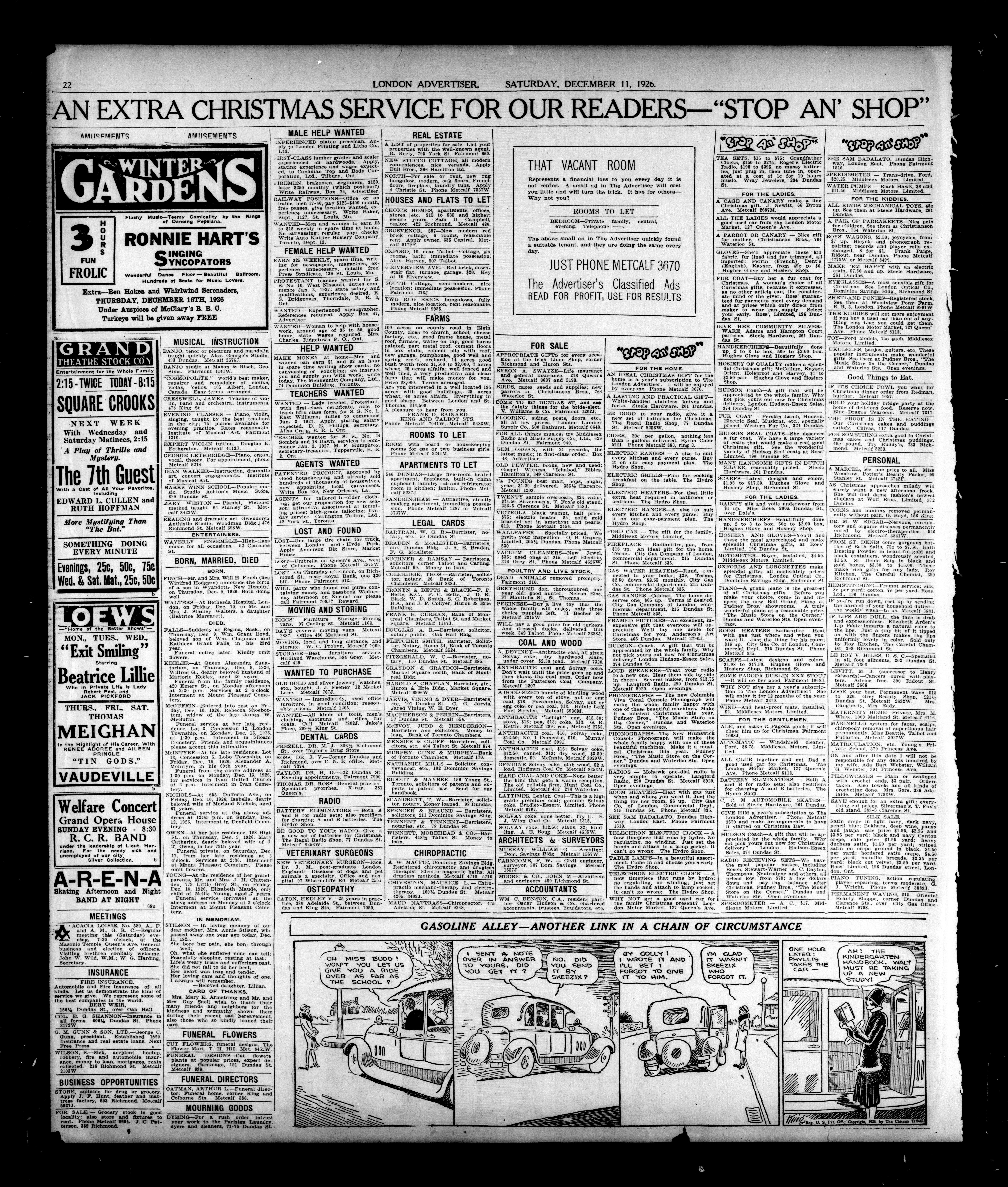 London, Ontario : London Advertiser Company, Limited, [1926]; 24 images, 0 avec recherche en texte intégral