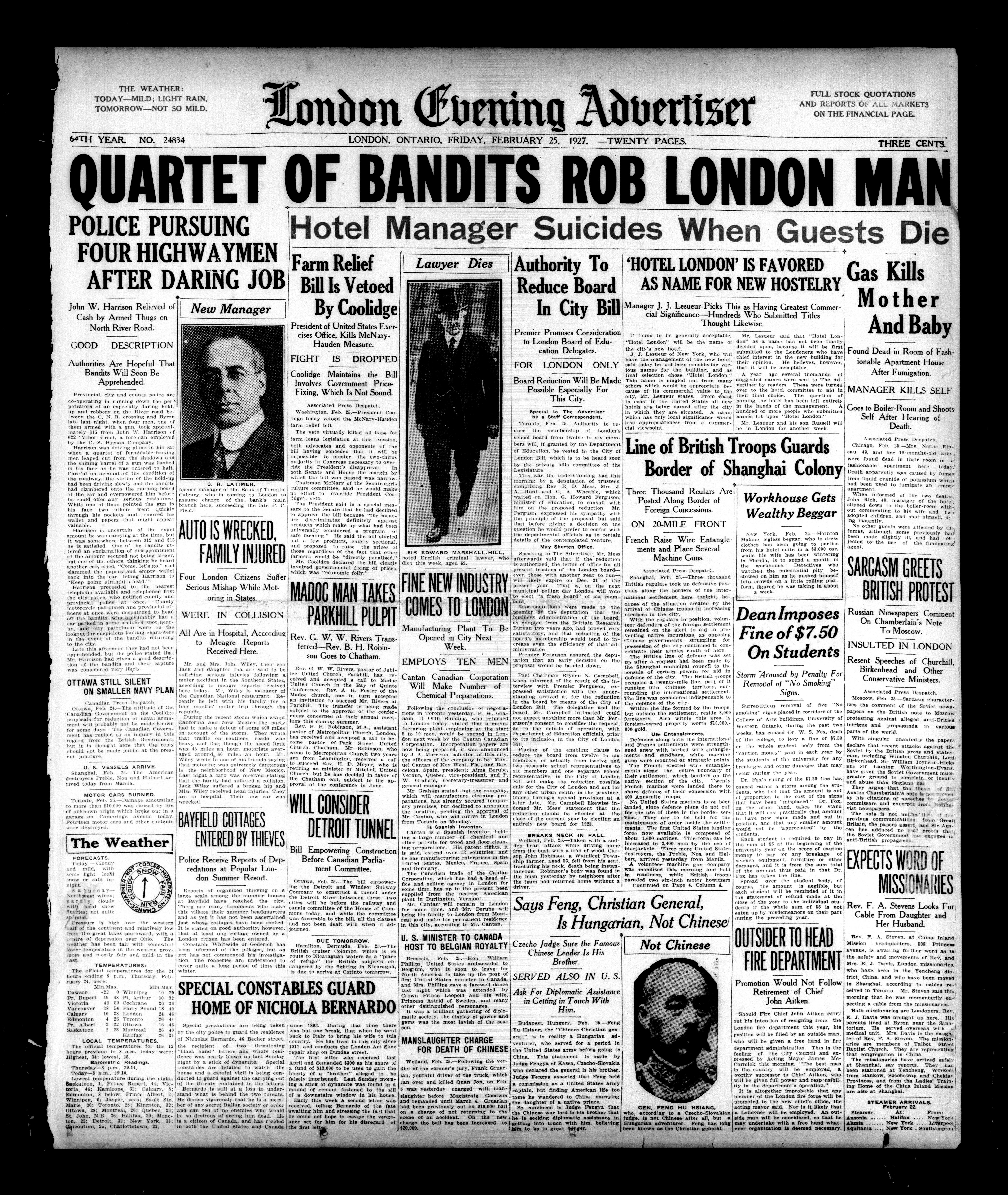London, Ontario : London Advertiser Company, Limited, [1927]; 20 images, 0 avec recherche en texte intégral