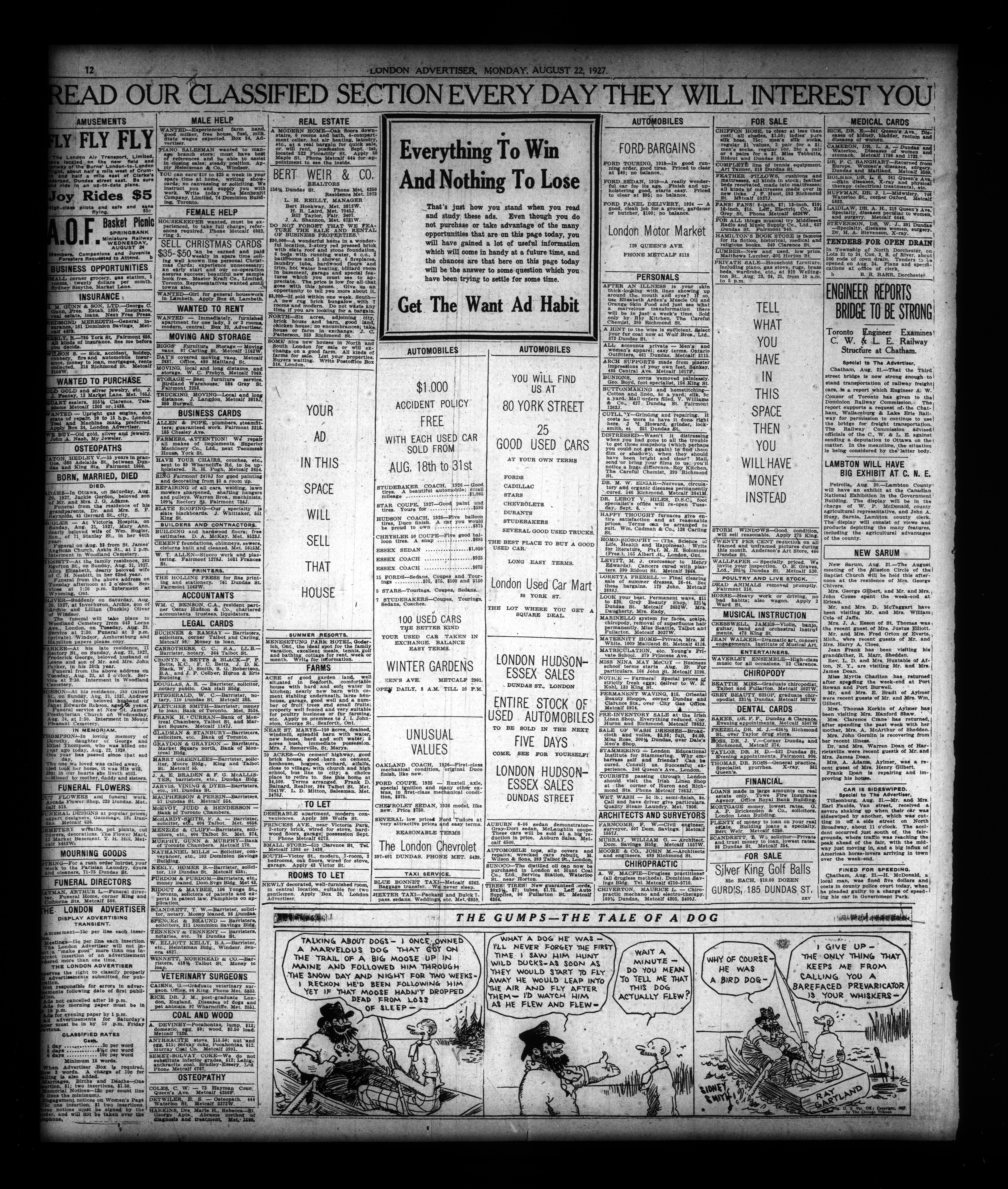 London, Ontario : London Advertiser Company, Limited, [1927]; 14 images, 0 avec recherche en texte intégral