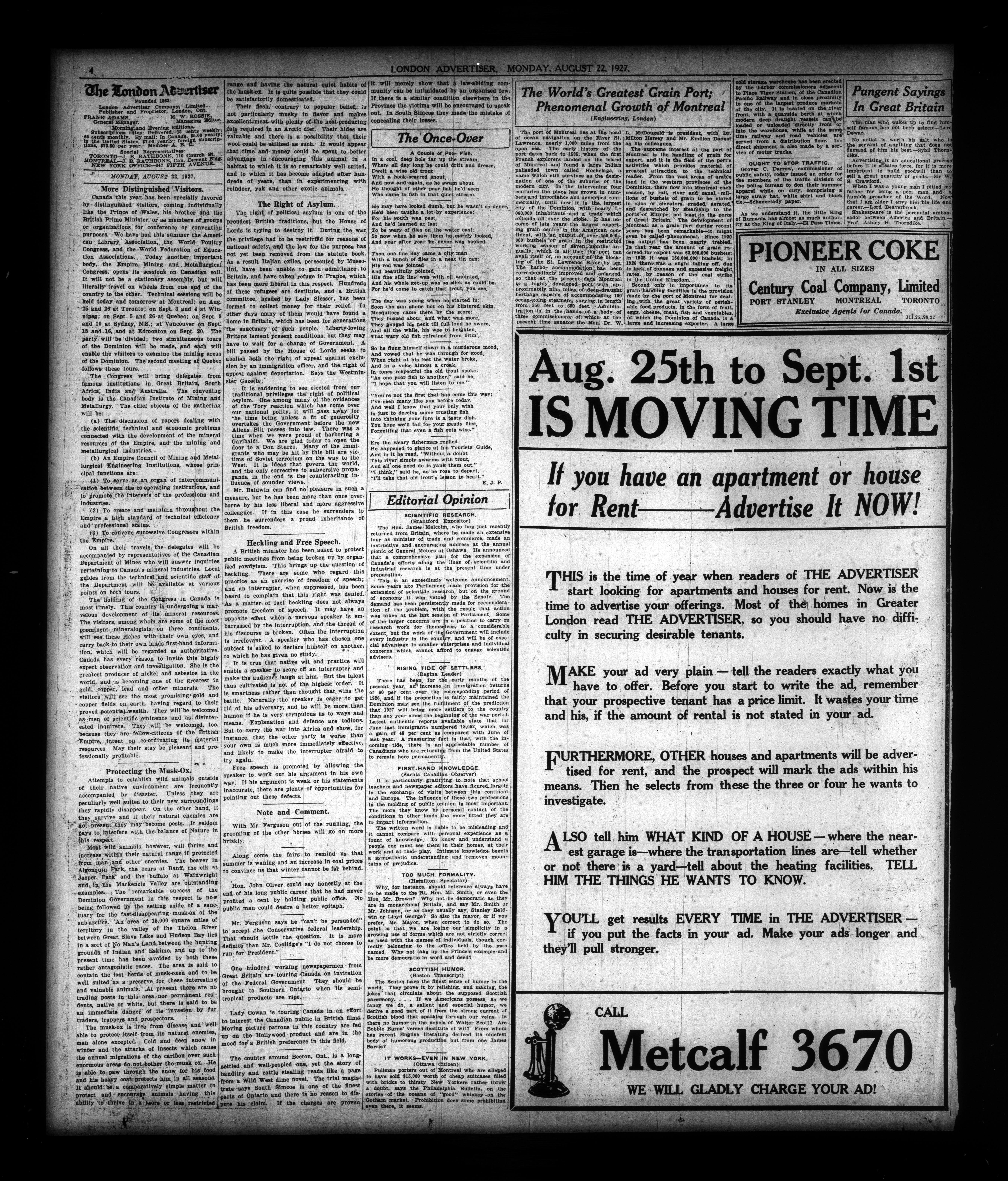 London, Ontario : London Advertiser Company, Limited, [1927]; 14 images, 0 avec recherche en texte intégral
