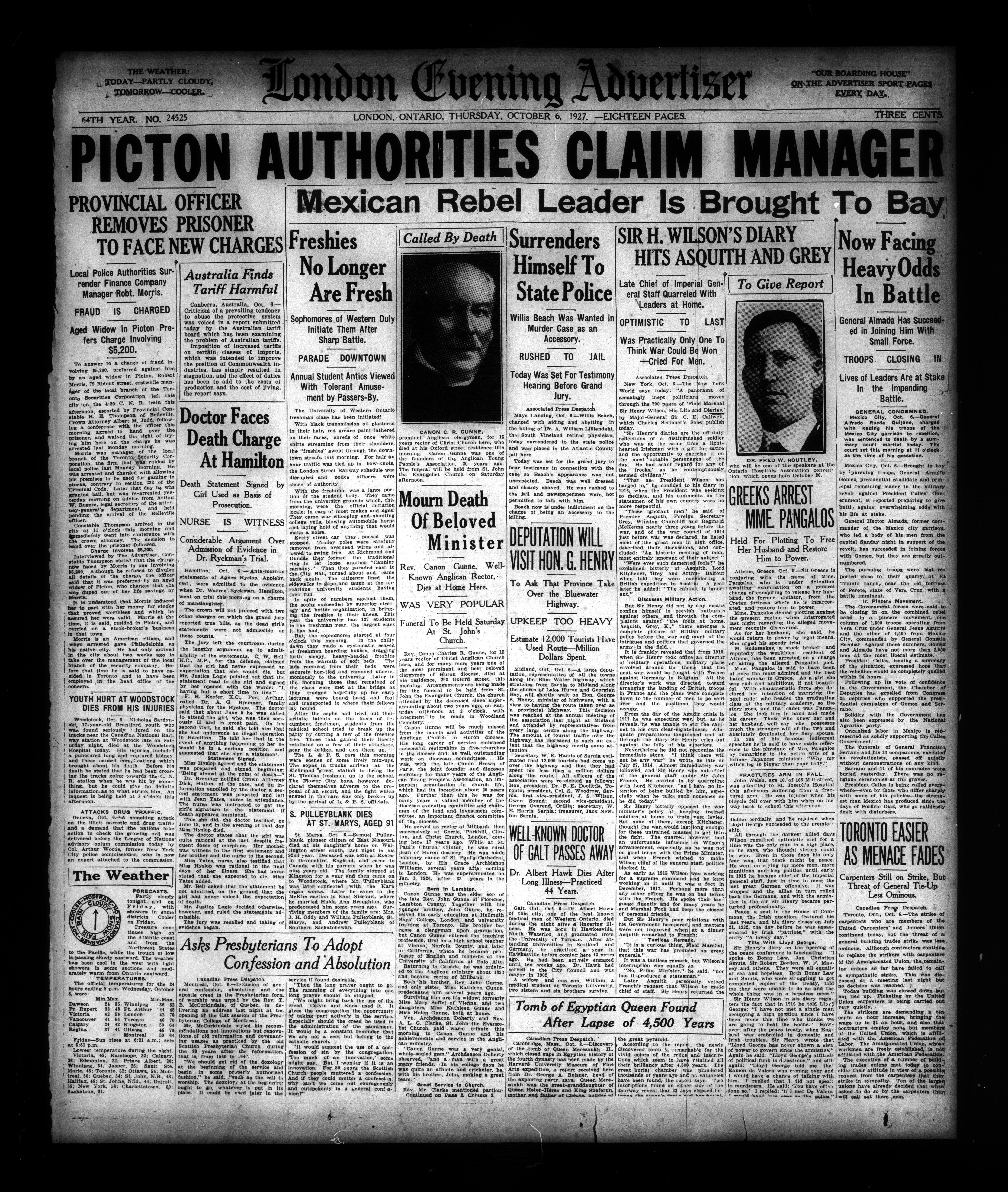 London, Ontario : London Advertiser Company, Limited, [1927]; 18 images, 0 avec recherche en texte intégral