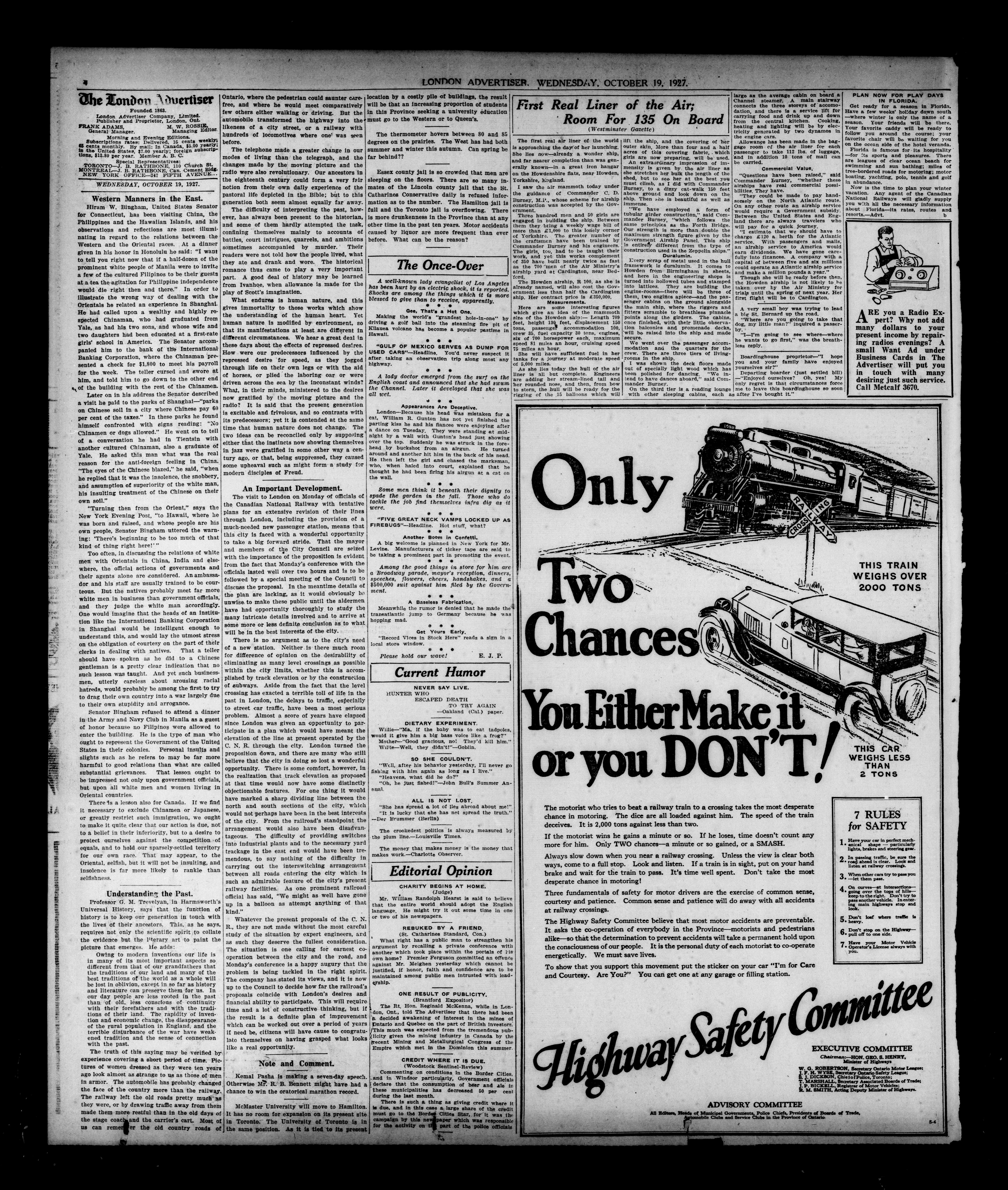 London Evening Advertiser. : London evening advertiser : 64th Year, No. 24536 (October 19, 1927)