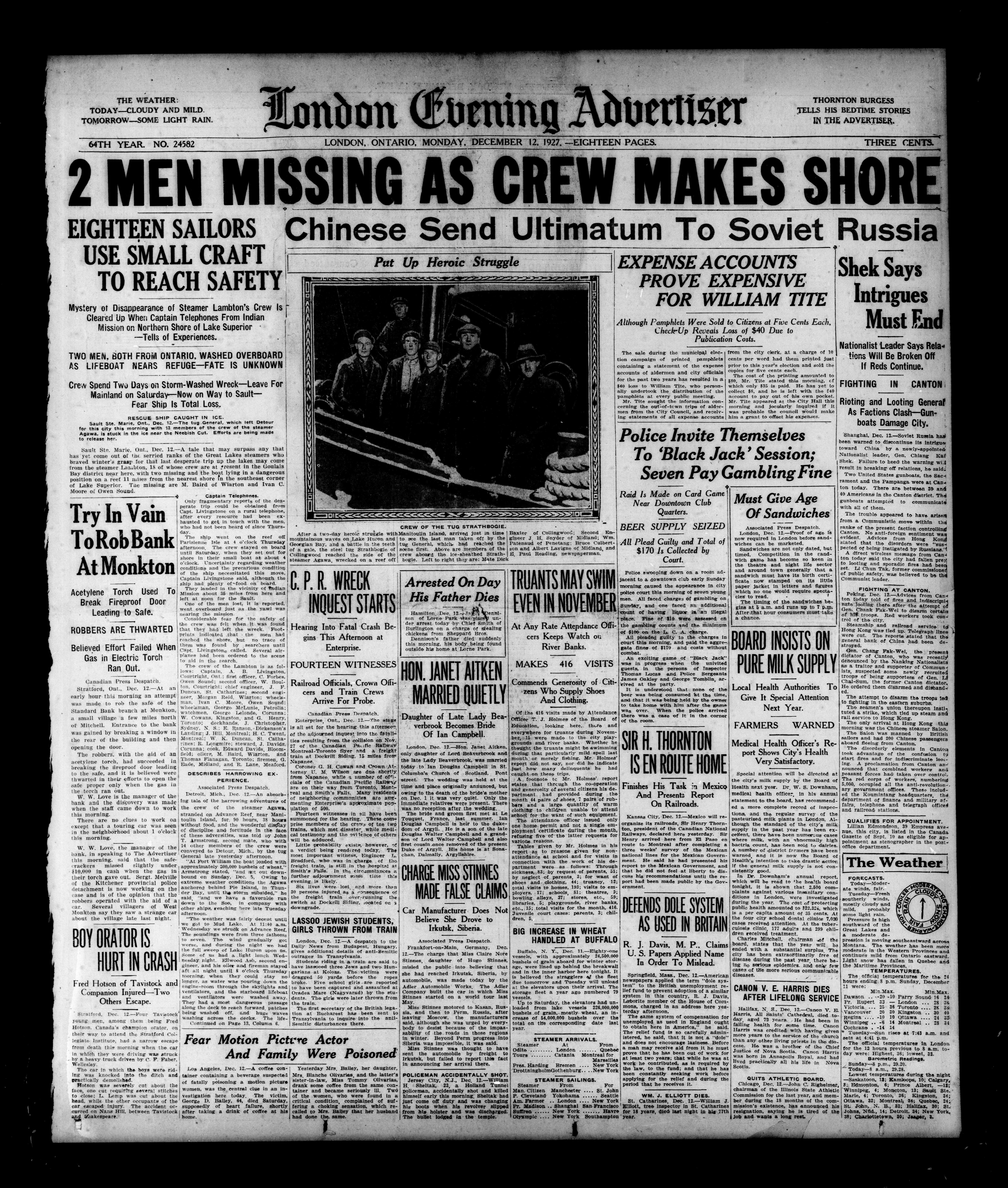 London Evening Advertiser. : London evening advertiser : 64th Year, No. 24582 (December 12, 1927)