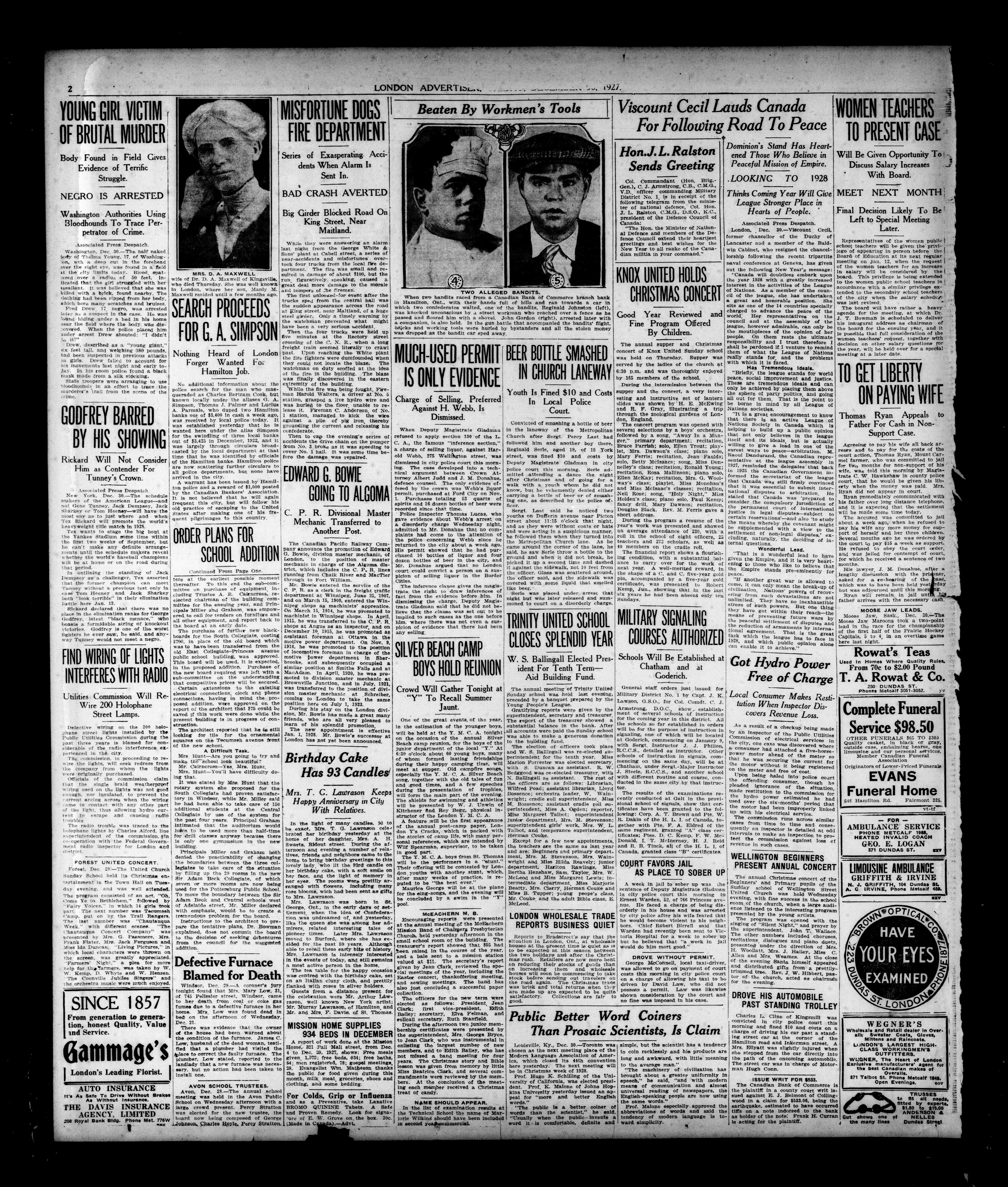 London Evening Advertiser. : London evening advertiser : 64th Year, No. 24598 (December 30, 1927)