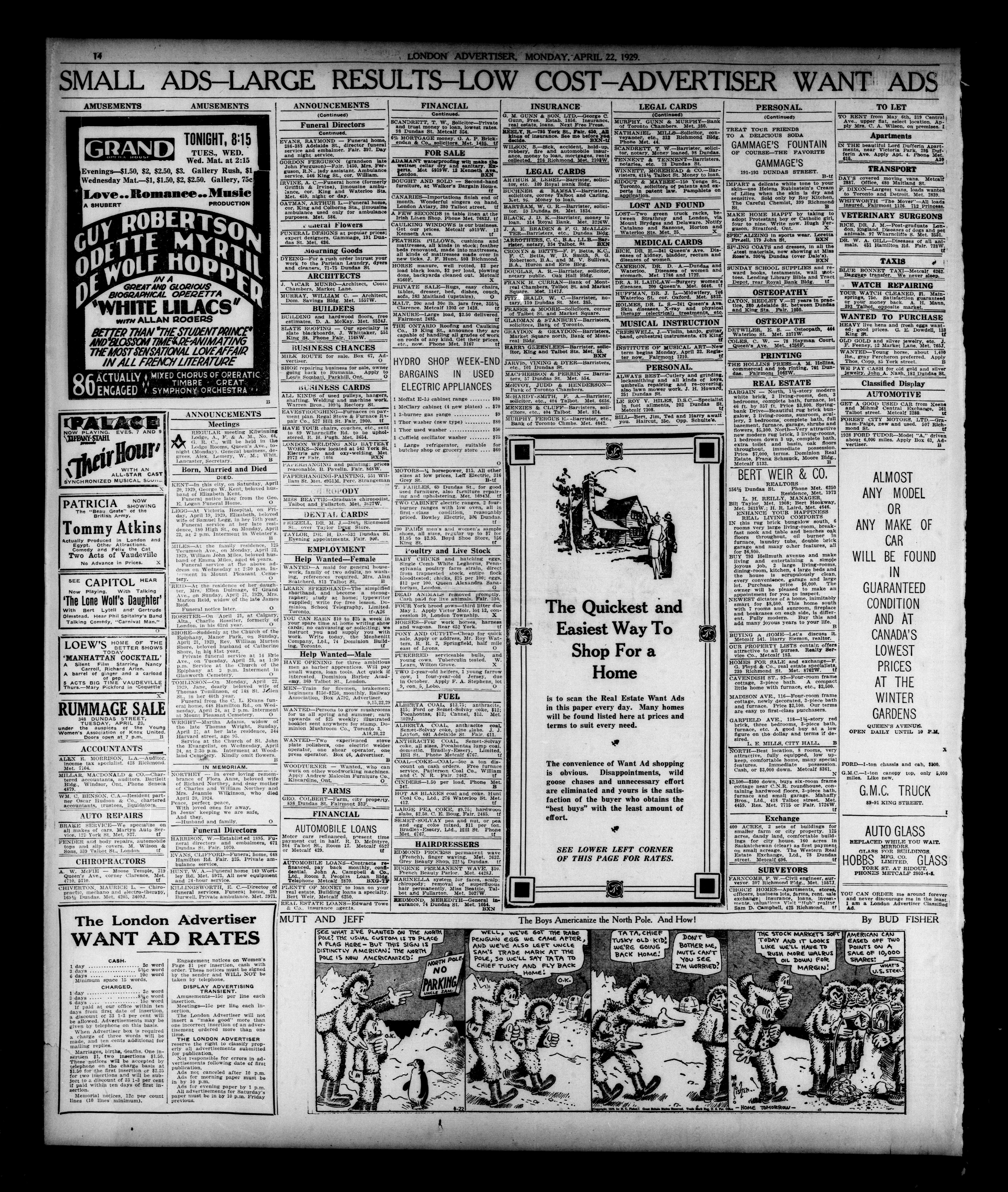 London, Ontario : London Advertiser Company, Limited, [1929]; 16 images, 0 avec recherche en texte intégral