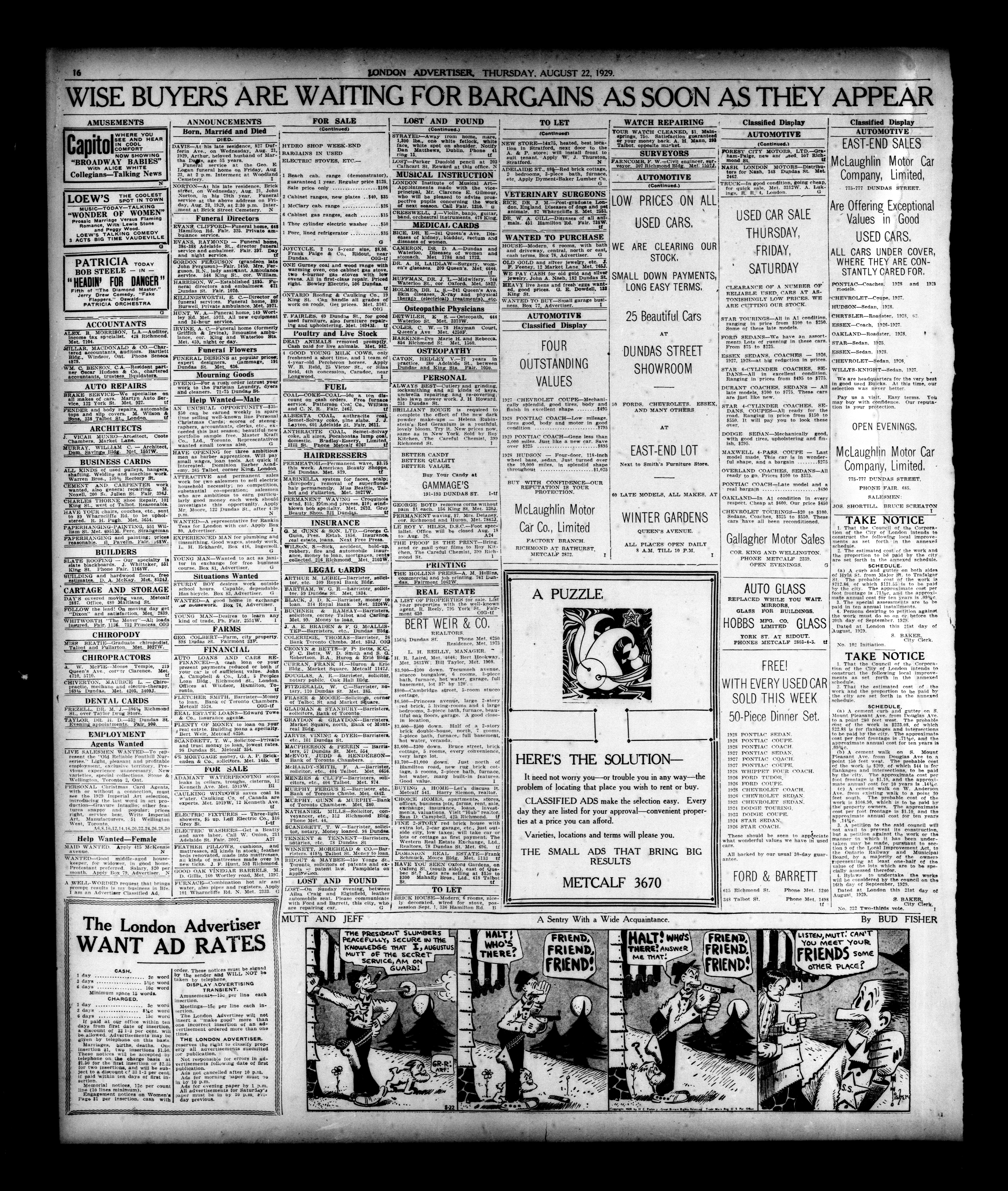 London, Ontario : London Advertiser Company, Limited, [1929]; 18 images, 0 avec recherche en texte intégral