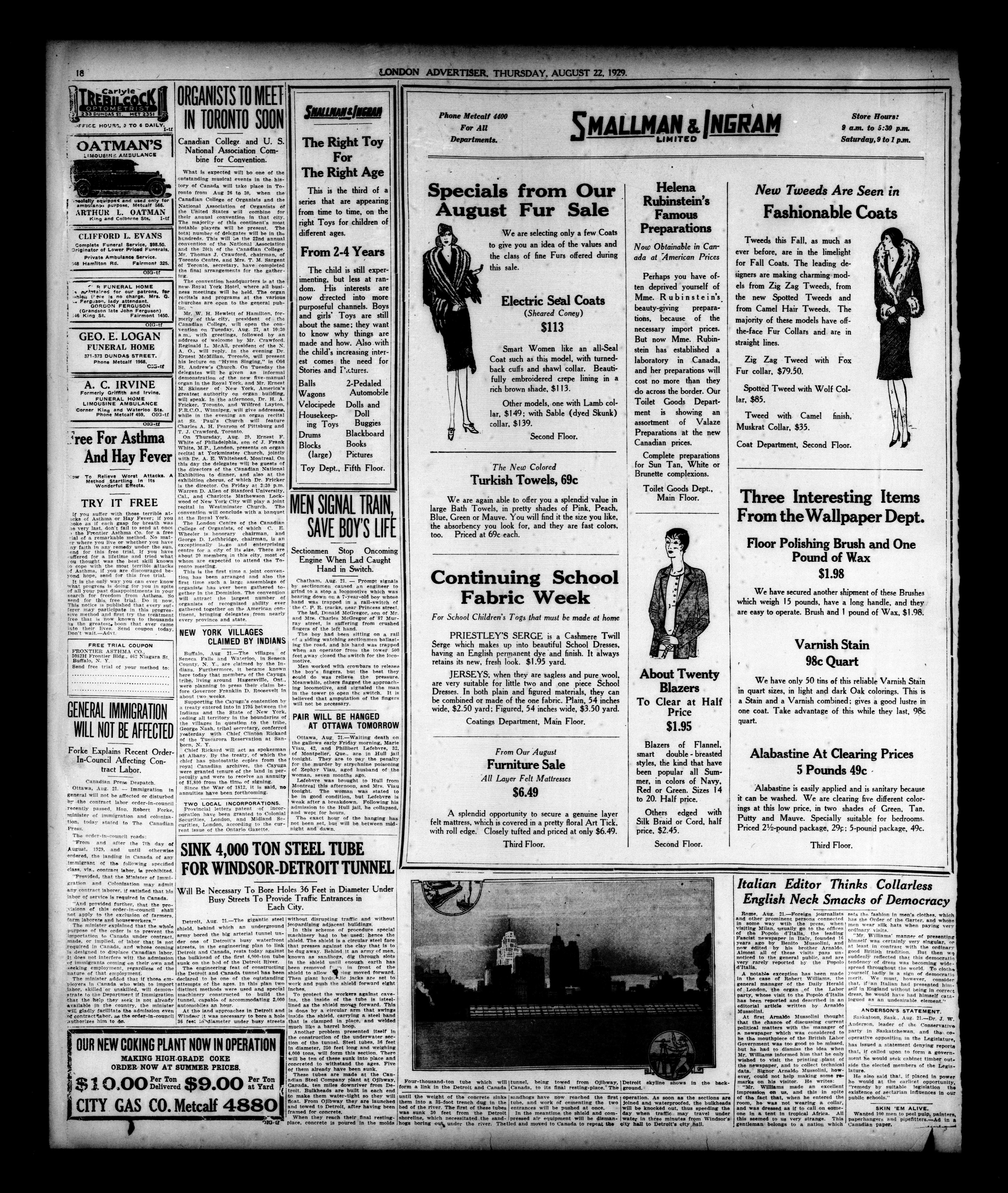 London, Ontario : London Advertiser Company, Limited, [1929]; 18 images, 0 avec recherche en texte intégral