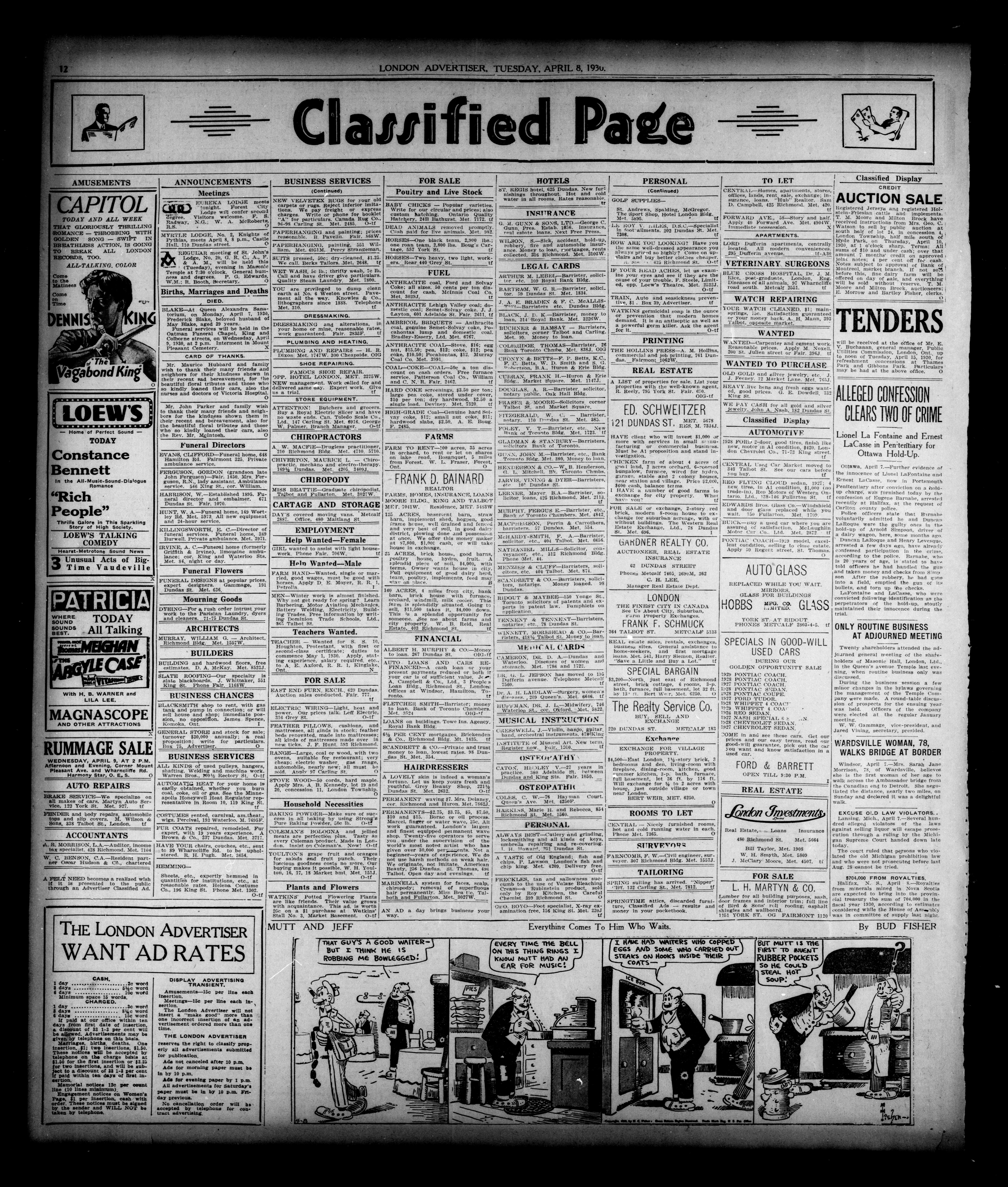 London, Ontario : London Advertiser Company, Limited, [1930]; 14 images, 0 avec recherche en texte intégral