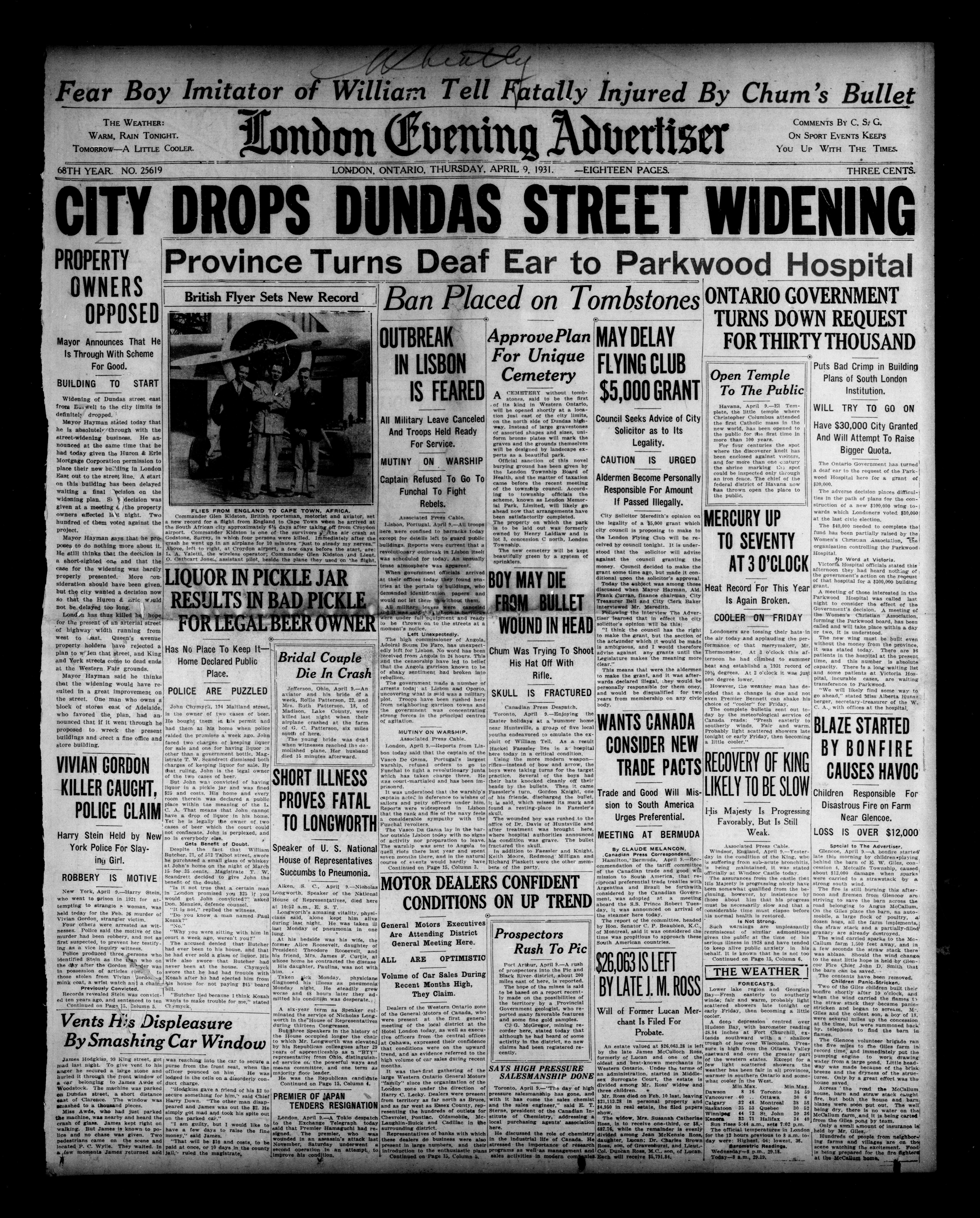 London, Ontario : London Advertiser Company, Limited, [1931]; 18 images, 0 avec recherche en texte intégral