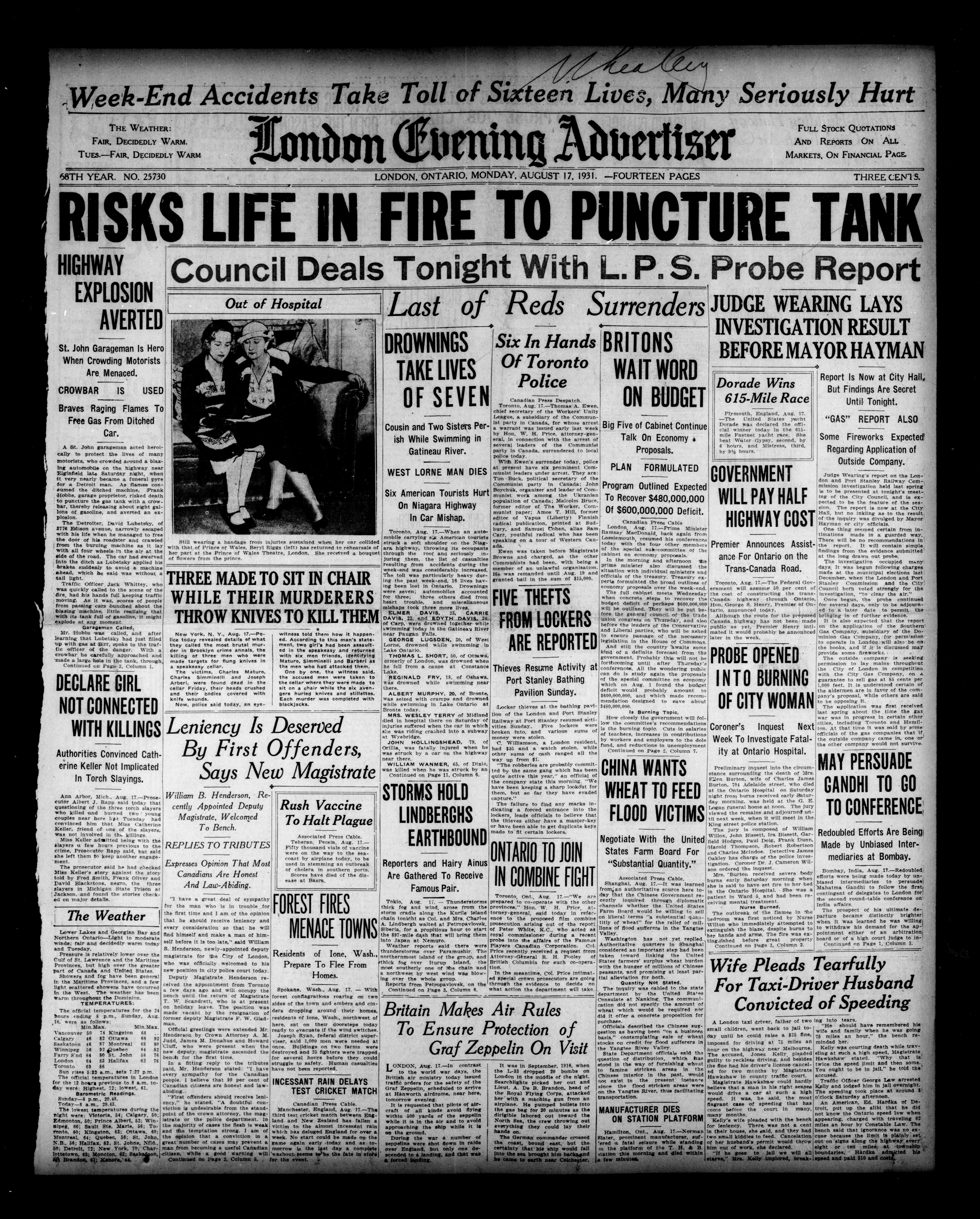 London Evening Advertiser. : London evening advertiser : 68th Year, No. 25730 (August 17, 1931)