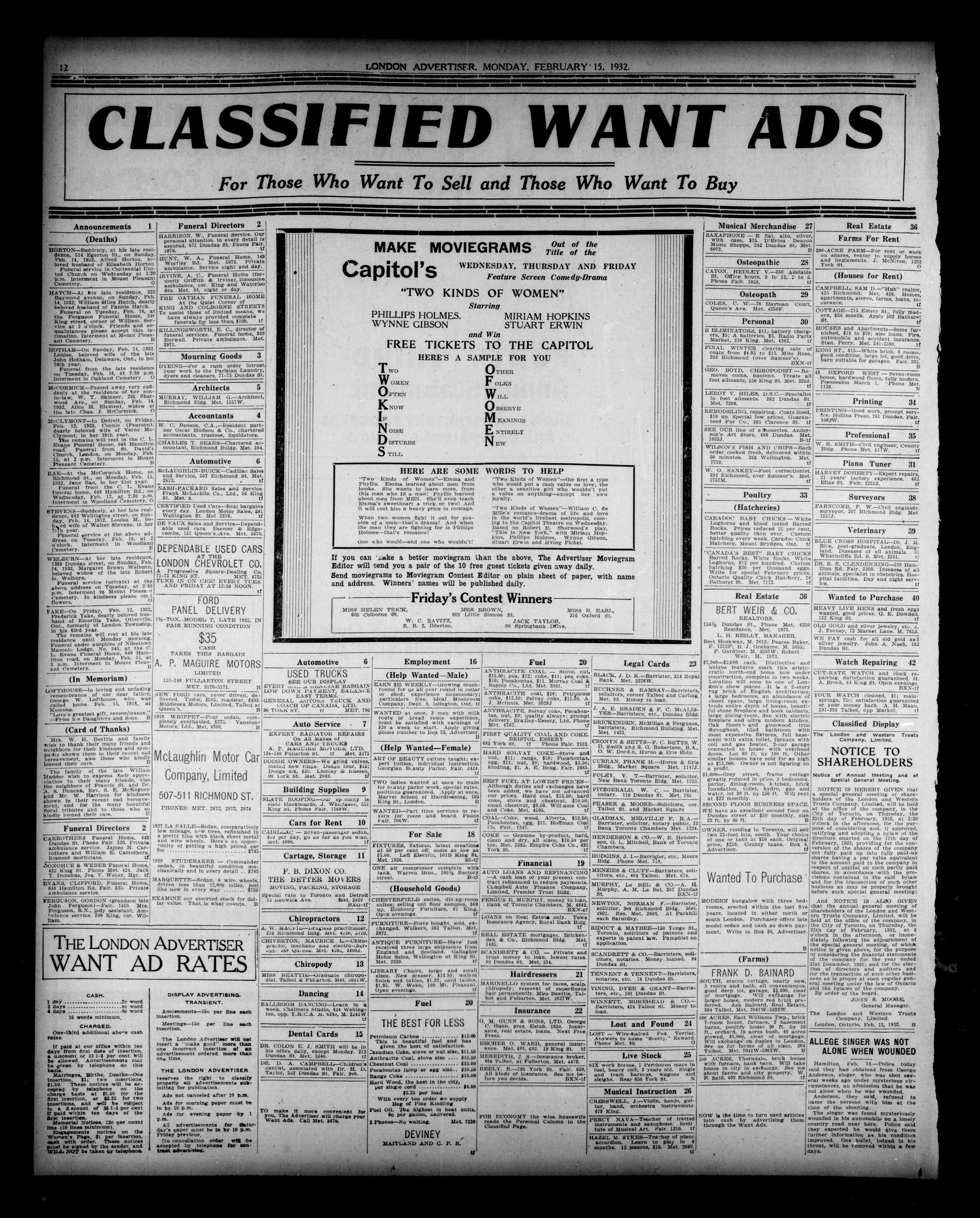 London, Ontario : London Advertiser Company, Limited, [1932]; 14 images, 0 with full-text search