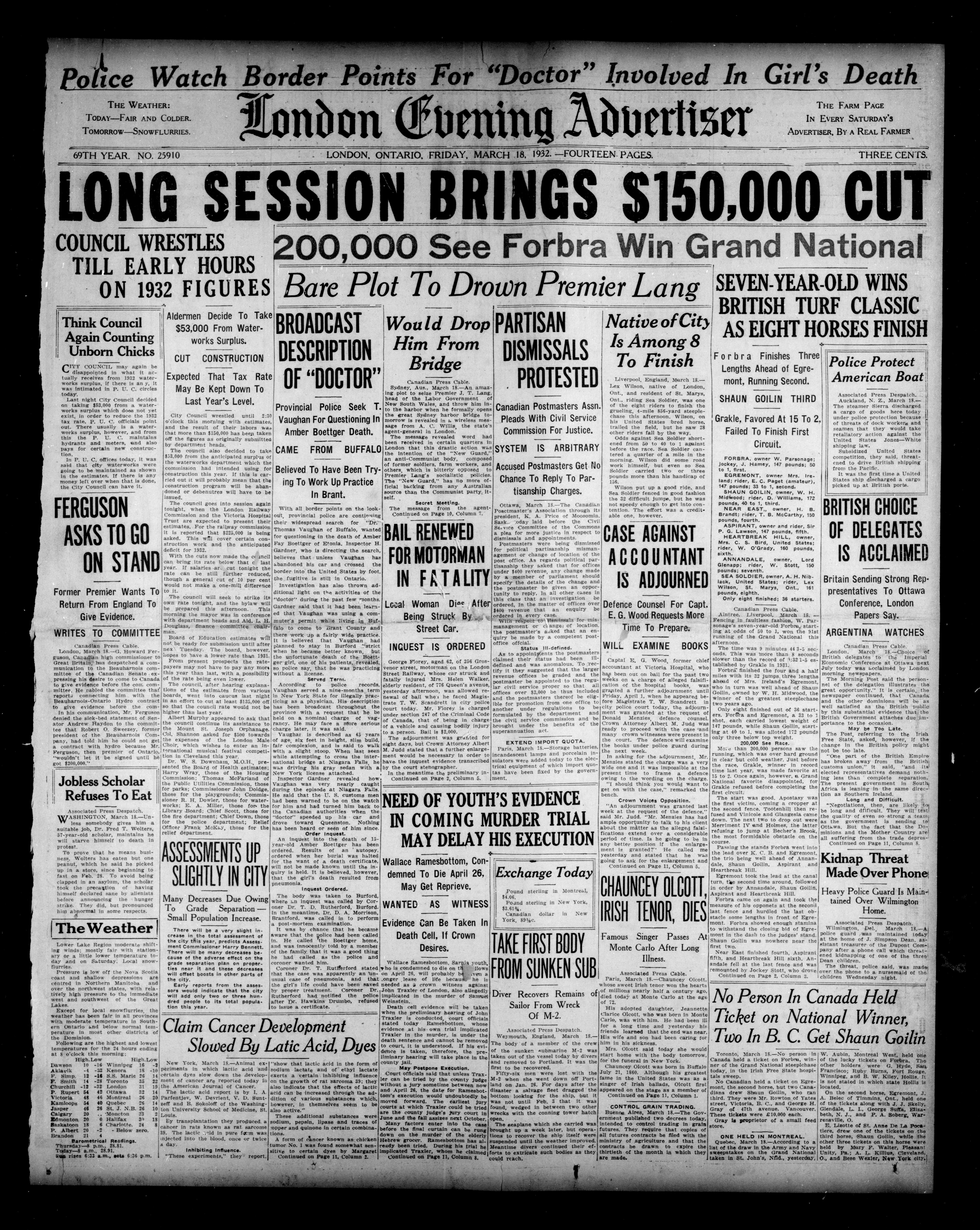 London Evening Advertiser. : London evening advertiser : 69th Year, No. 25910 (March 18, 1932)