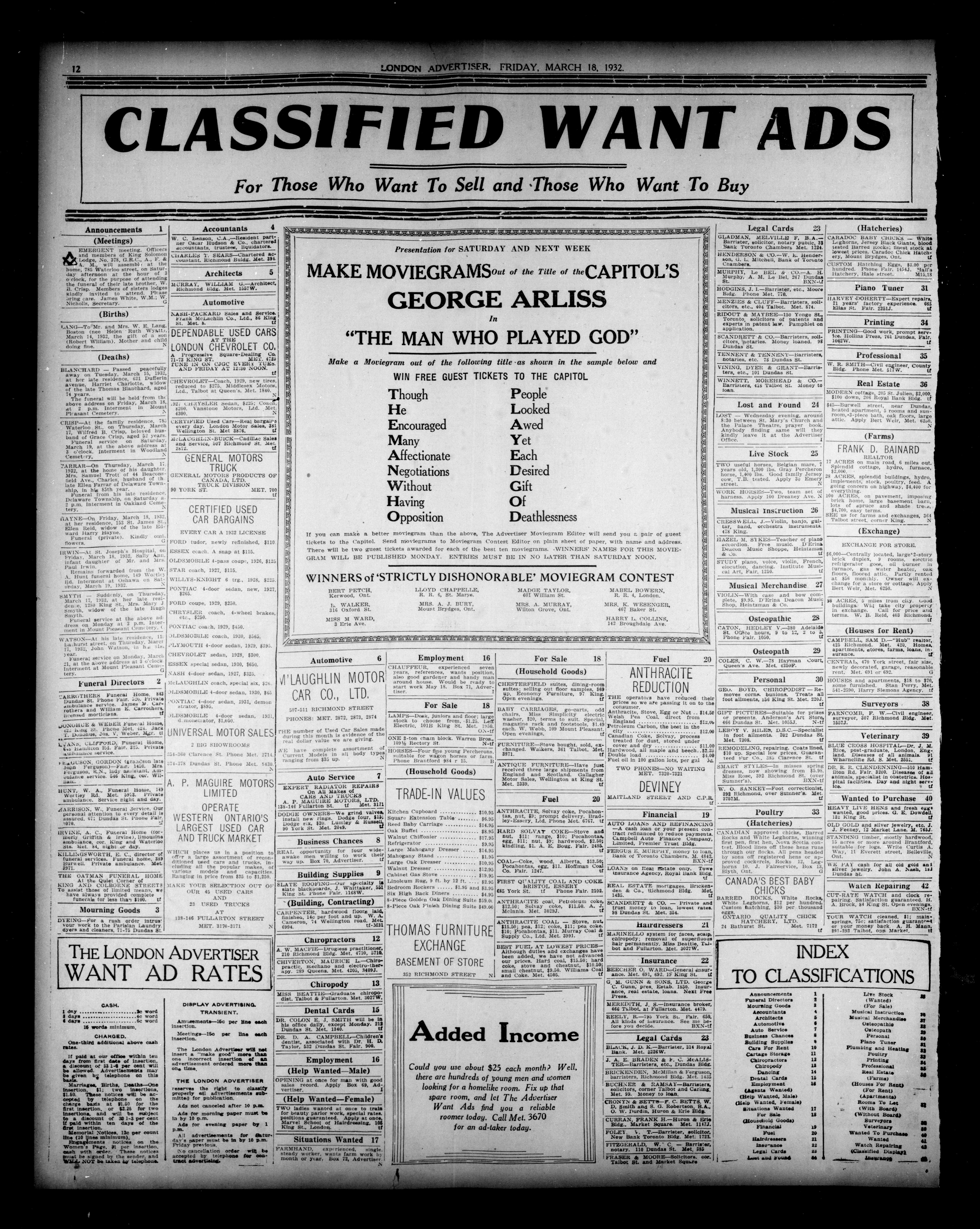 London, Ontario : London Advertiser Company, Limited, [1932]; 14 images, 0 avec recherche en texte intégral