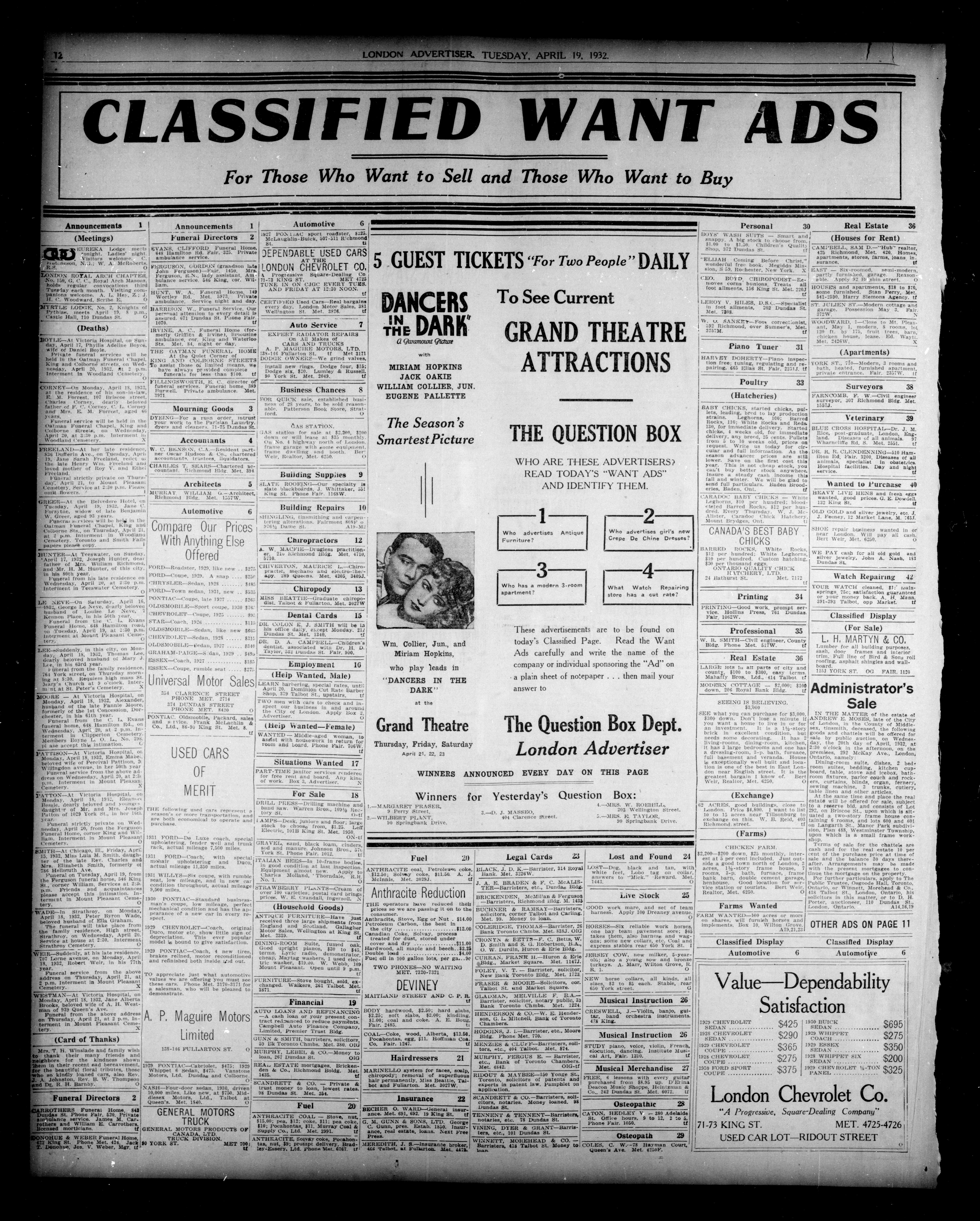 London, Ontario : London Advertiser Company, Limited, [1932]; 14 images, 0 avec recherche en texte intégral