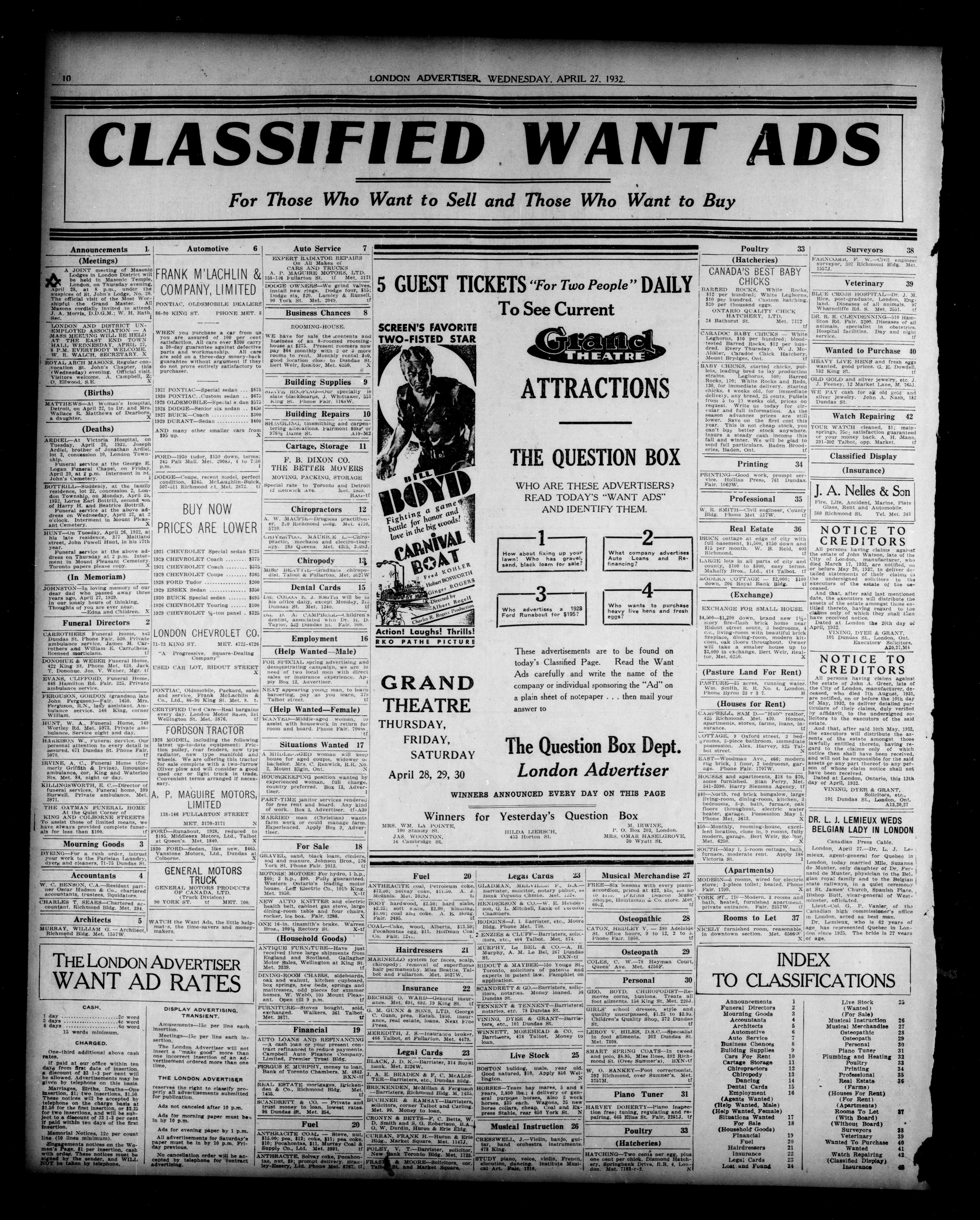 London, Ontario : London Advertiser Company, Limited, [1932]; 12 images, 0 avec recherche en texte intégral