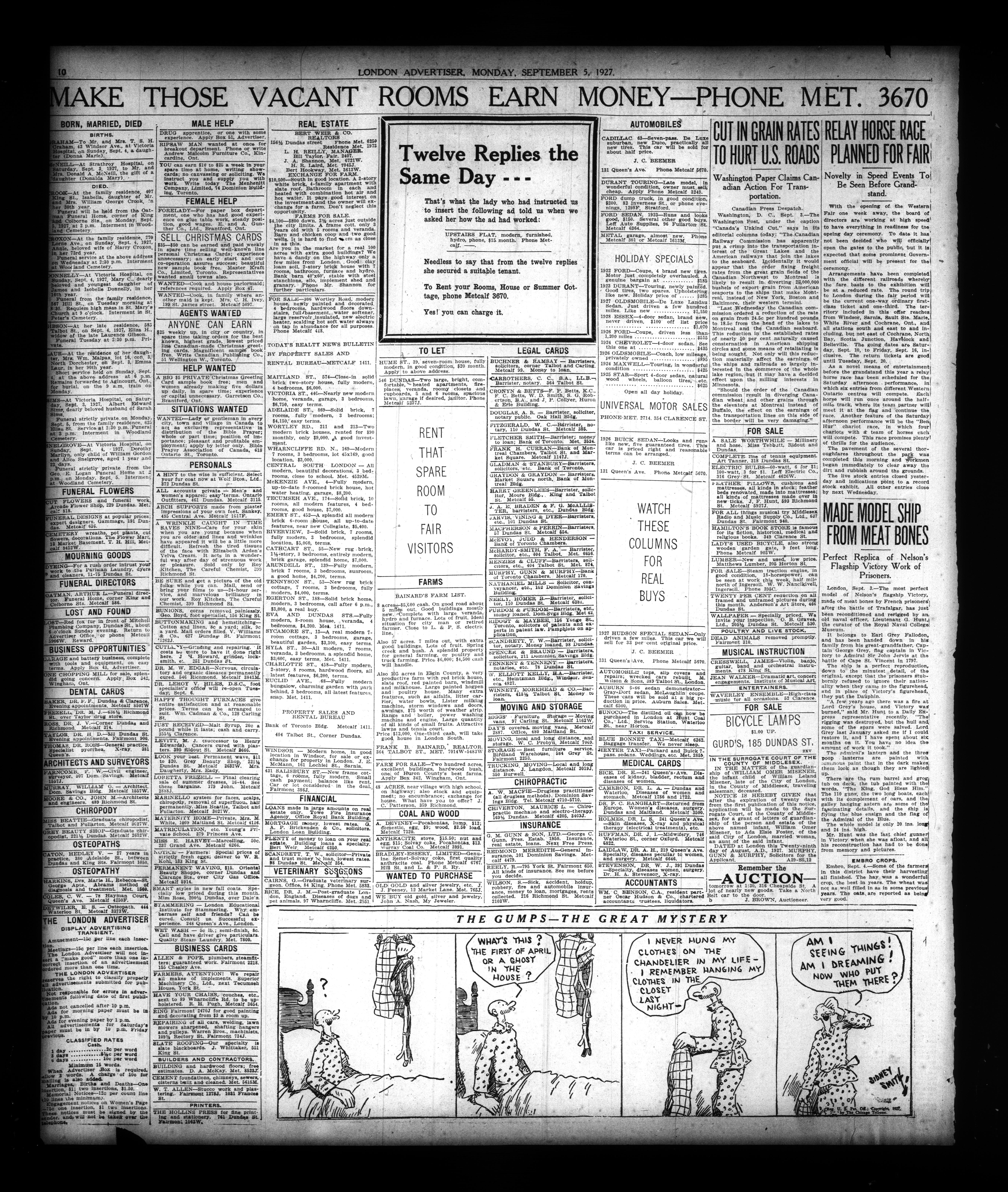 London, Ontario : London Advertiser Company, Limited, [1927]; 12 images, 0 avec recherche en texte intégral