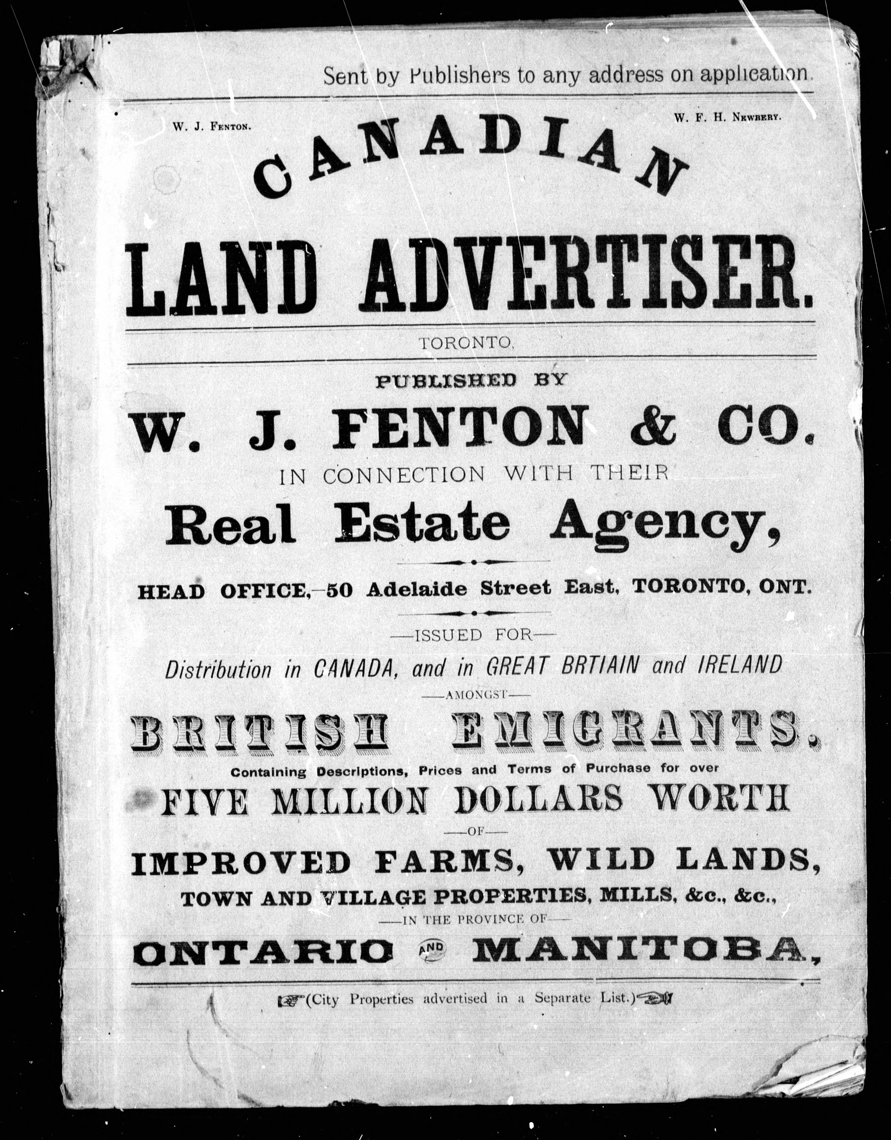 Canadian land advertiser : issued for distribution in Canada and in Great Britain and Ireland amongst British emigrants : containing descriptions, prices and terms of purchase for over five million dollars worth of improved farms, wild lands, town and village properties, mills, &c., &c., in the province of Ontario and Manitoba.