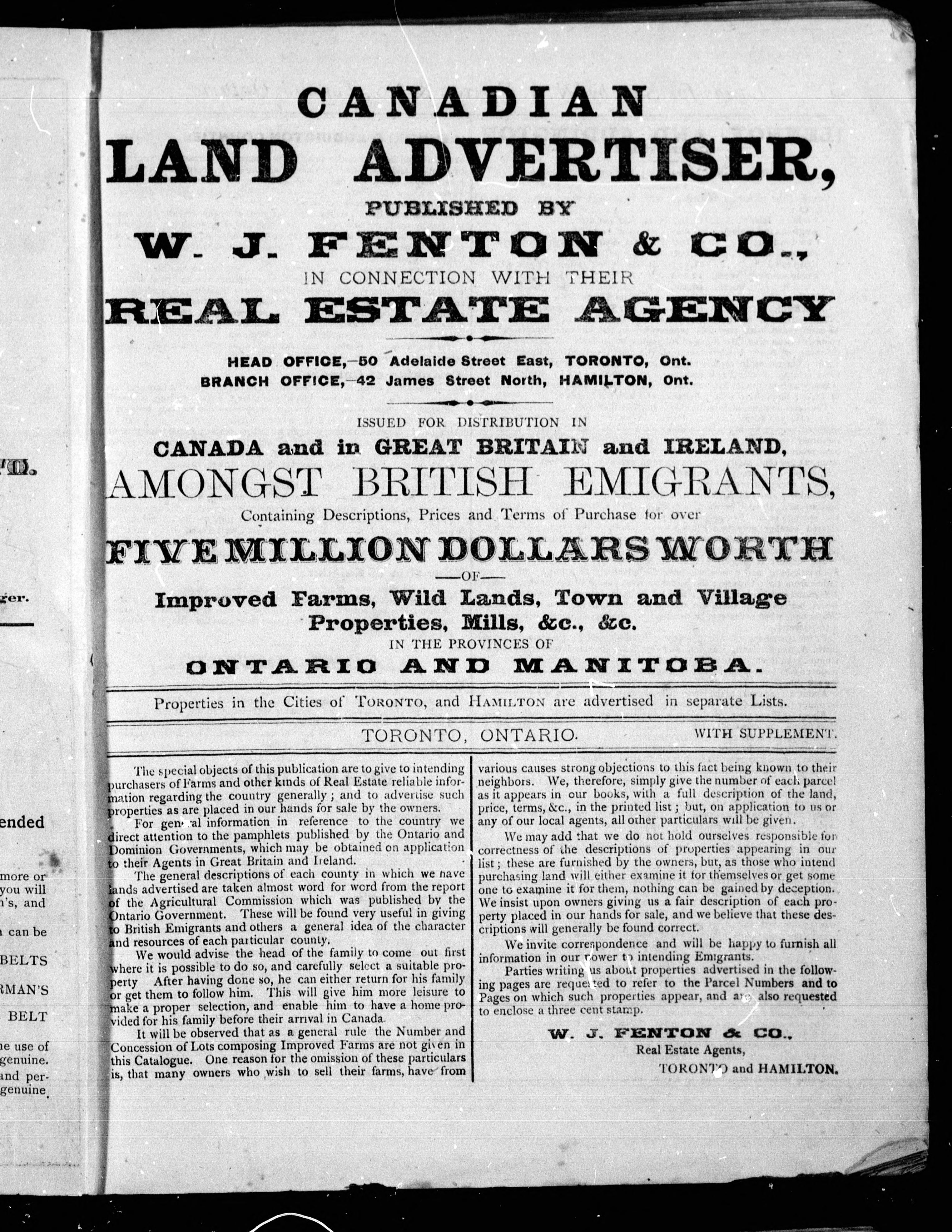 Canadian land advertiser : issued for distribution in Canada and in Great Britain and Ireland amongst British emigrants : containing descriptions, prices and terms of purchase for over five million dollars worth of improved farms, wild lands, town and village properties, mills, &c., &c., in the province of Ontario and Manitoba.