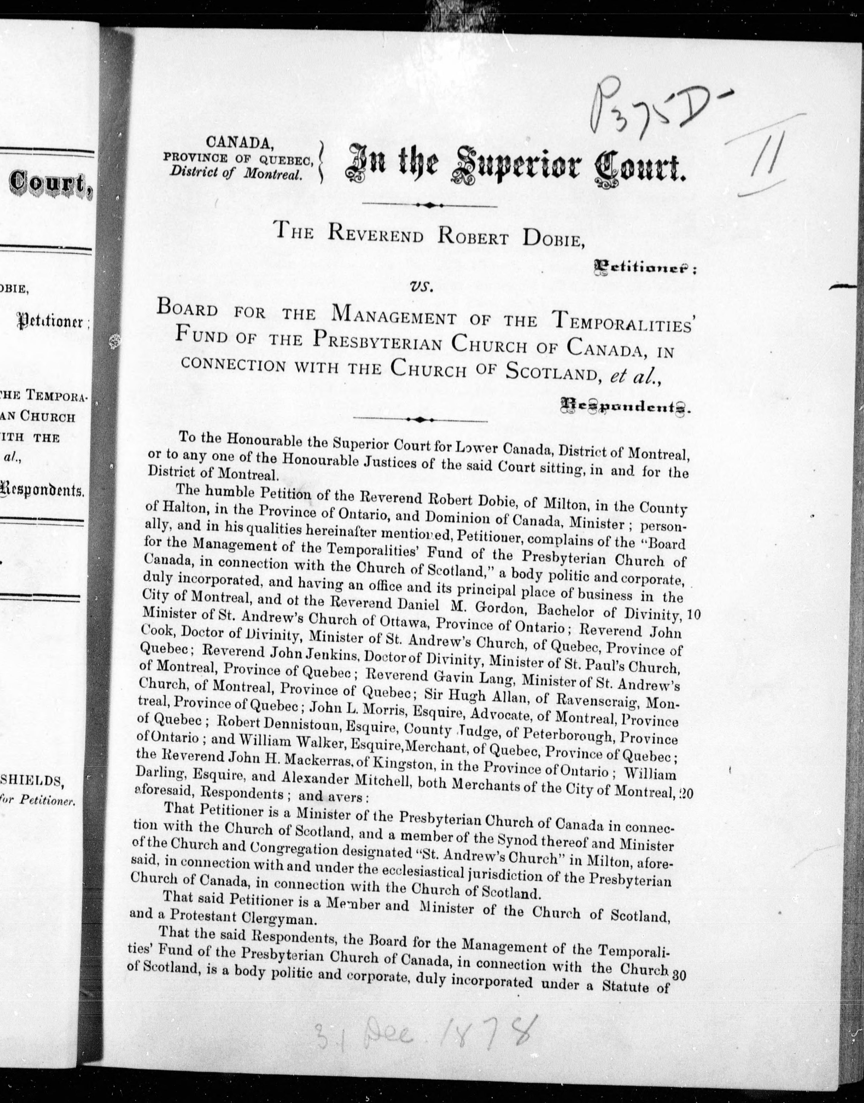 In the Superior Court : the Reverend Robert Dobie, petitioner, vs. Board for the Management of the Temporalities' Fund of the Presbyterian Church of Canada, in connection with the Church of Scotland, et al., repondents.