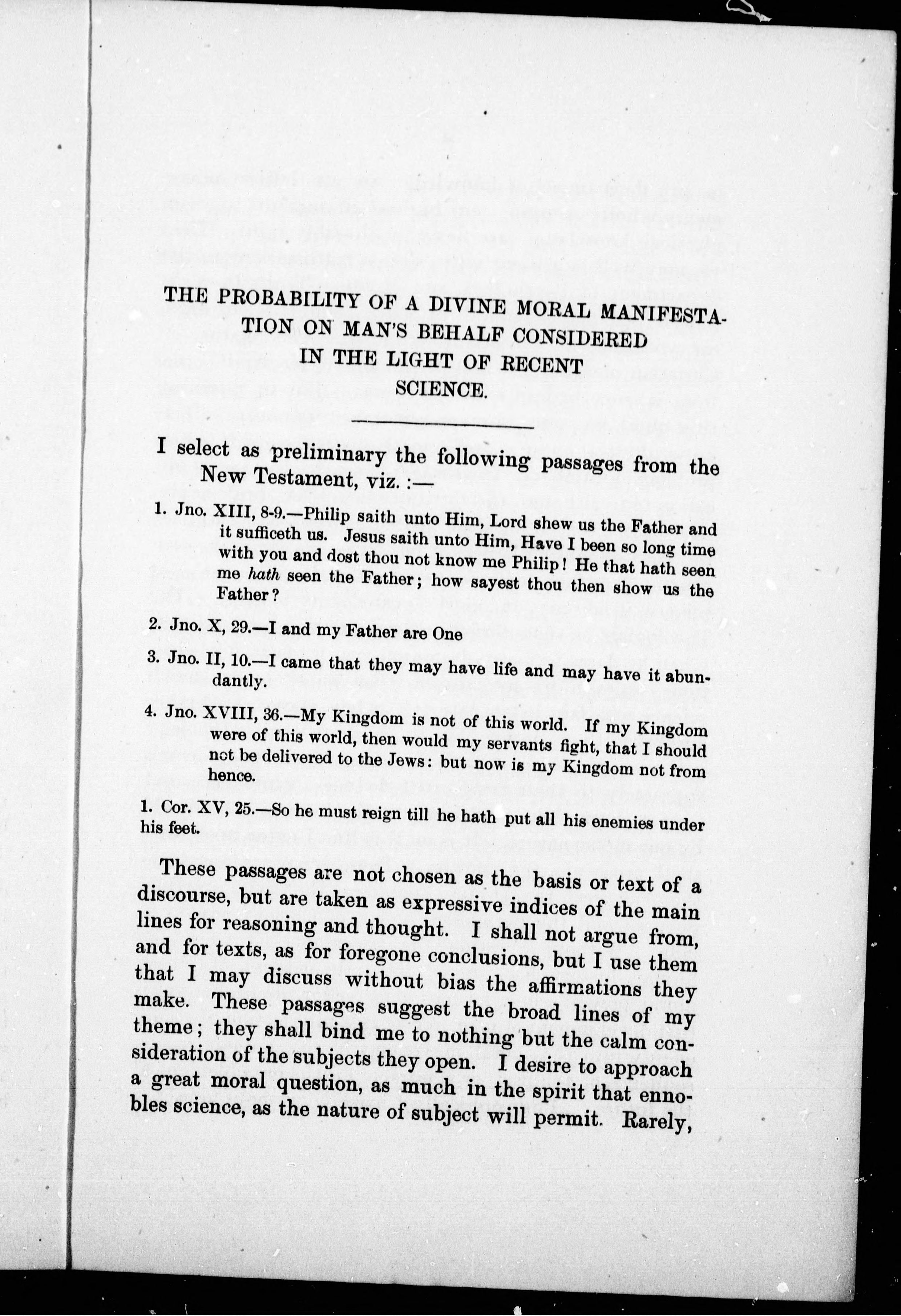Caption title: The probability of a divine moral manifestation on man' s behalf considered in the light of recent science.