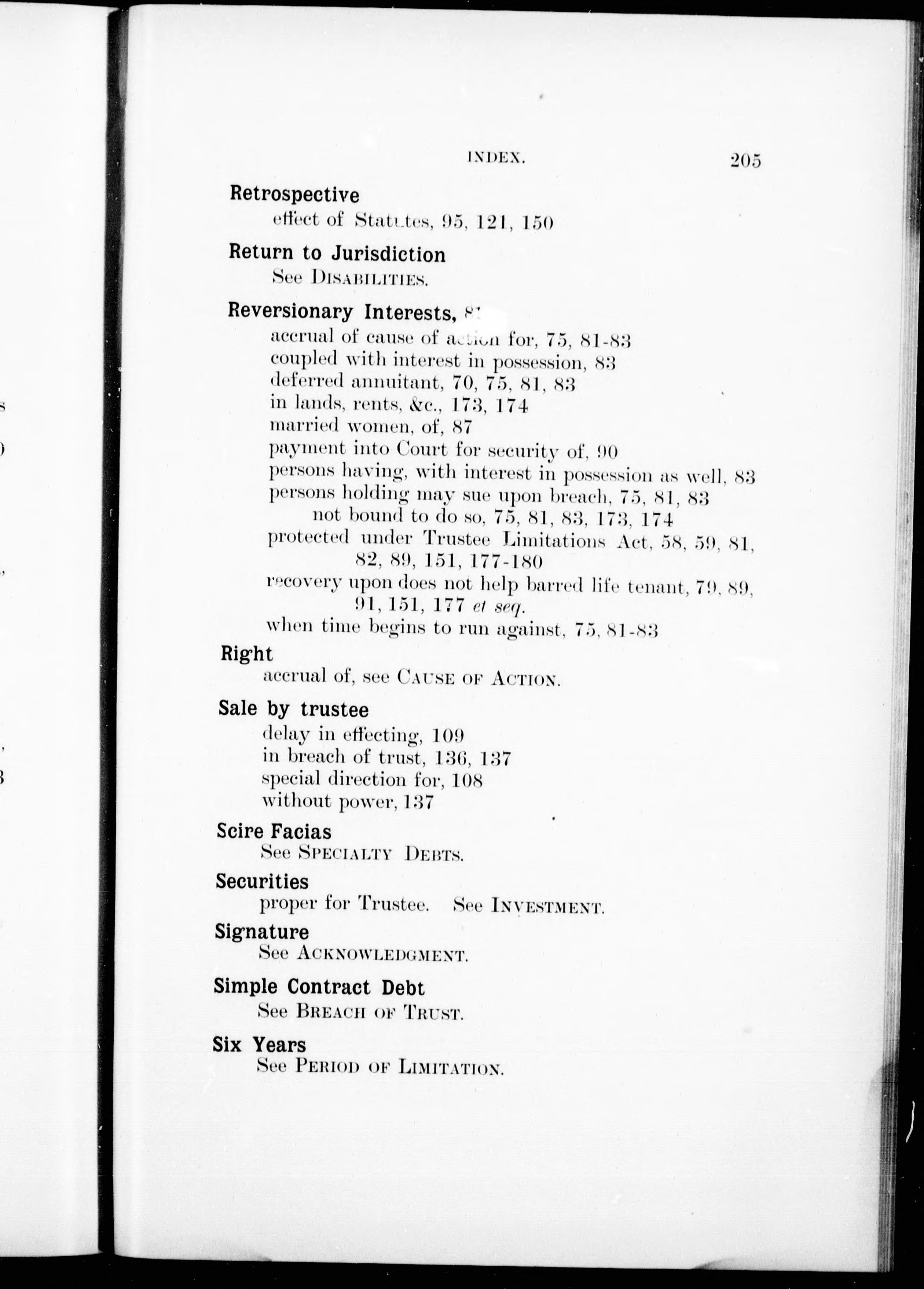 Limitations of actions against trustees and relief from liability for technical breaches of trust : being a concise treatise upon the position of trustees as affected by the Imperial Statute, 51 and 52 Victoriae, cap. 59, section 8, the Revised Statute of Ontario (1897), cap. 129, section 32, The Nova Scotia Statute, 52 Victoriae, cap. 18, section 17, and by the Imperial Statute, 59 and 60 Victoriae, cap. 35, section 3, the Ontario Statute, 62 Victoriae, cap. 15, section 1, the New Brunswick Statute, 61 Victoriae, cap. 26 : with an appendix of statutes, copious references and a very full index