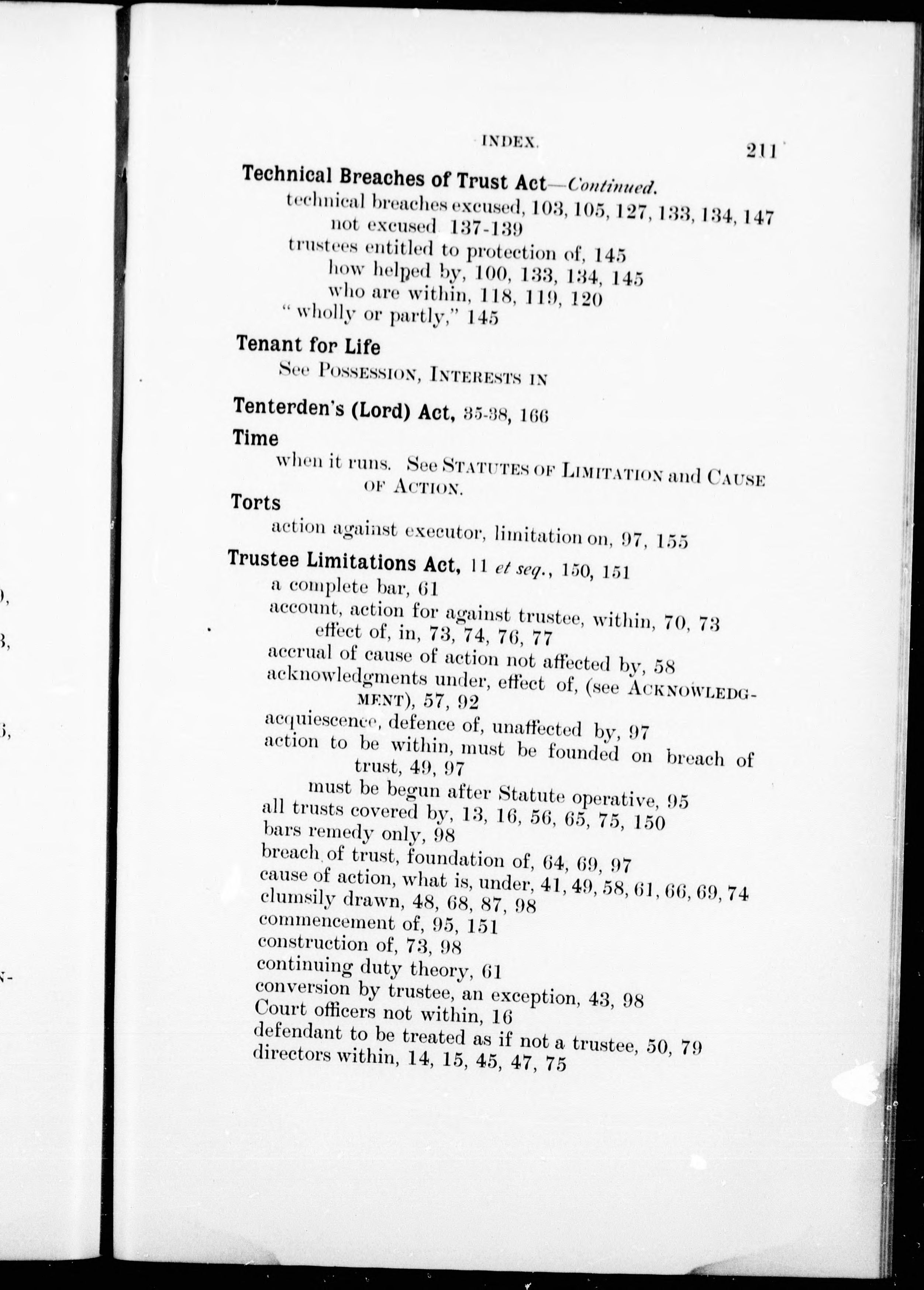 Limitations of actions against trustees and relief from liability for technical breaches of trust : being a concise treatise upon the position of trustees as affected by the Imperial Statute, 51 and 52 Victoriae, cap. 59, section 8, the Revised Statute of Ontario (1897), cap. 129, section 32, The Nova Scotia Statute, 52 Victoriae, cap. 18, section 17, and by the Imperial Statute, 59 and 60 Victoriae, cap. 35, section 3, the Ontario Statute, 62 Victoriae, cap. 15, section 1, the New Brunswick Statute, 61 Victoriae, cap. 26 : with an appendix of statutes, copious references and a very full index - Adresse bibliographique