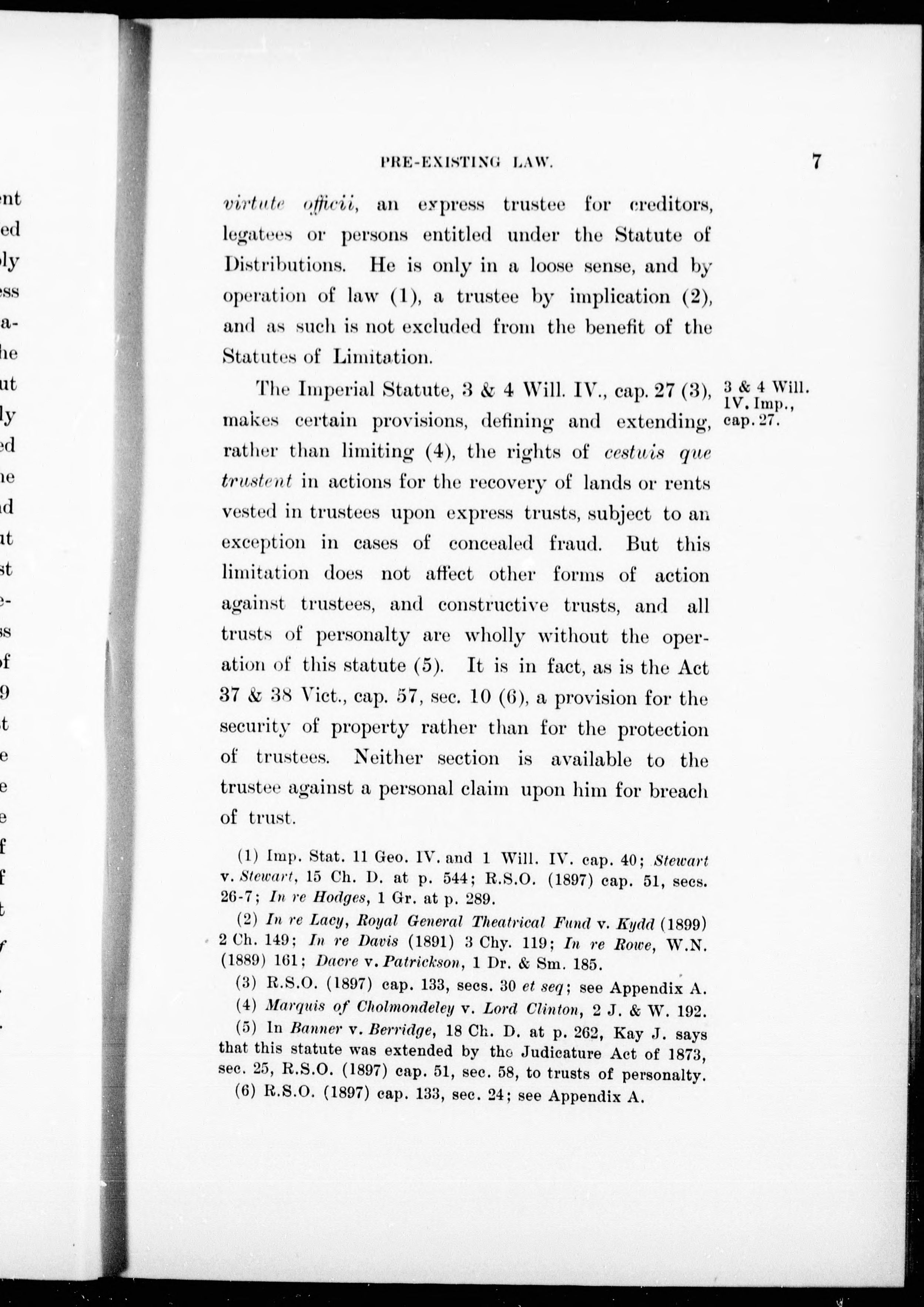 Limitations of actions against trustees and relief from liability for technical breaches of trust : being a concise treatise upon the position of trustees as affected by the Imperial Statute, 51 and 52 Victoriae, cap. 59, section 8, the Revised Statute of Ontario (1897), cap. 129, section 32, The Nova Scotia Statute, 52 Victoriae, cap. 18, section 17, and by the Imperial Statute, 59 and 60 Victoriae, cap. 35, section 3, the Ontario Statute, 62 Victoriae, cap. 15, section 1, the New Brunswick Statute, 61 Victoriae, cap. 26 : with an appendix of statutes, copious references and a very full index - Adresse bibliographique