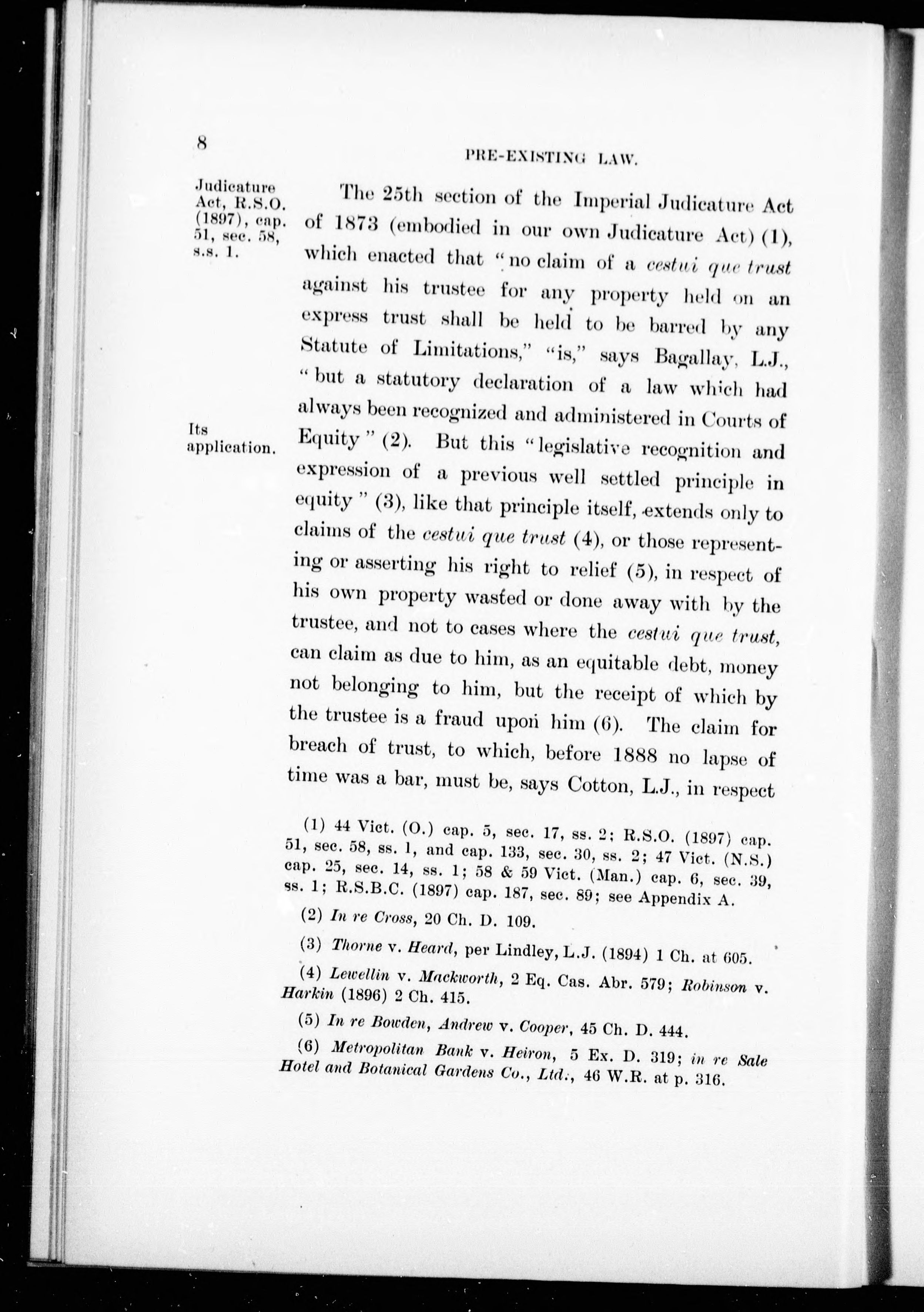 Limitations of actions against trustees and relief from liability for technical breaches of trust : being a concise treatise upon the position of trustees as affected by the Imperial Statute, 51 and 52 Victoriae, cap. 59, section 8, the Revised Statute of Ontario (1897), cap. 129, section 32, The Nova Scotia Statute, 52 Victoriae, cap. 18, section 17, and by the Imperial Statute, 59 and 60 Victoriae, cap. 35, section 3, the Ontario Statute, 62 Victoriae, cap. 15, section 1, the New Brunswick Statute, 61 Victoriae, cap. 26 : with an appendix of statutes, copious references and a very full index - Adresse bibliographique