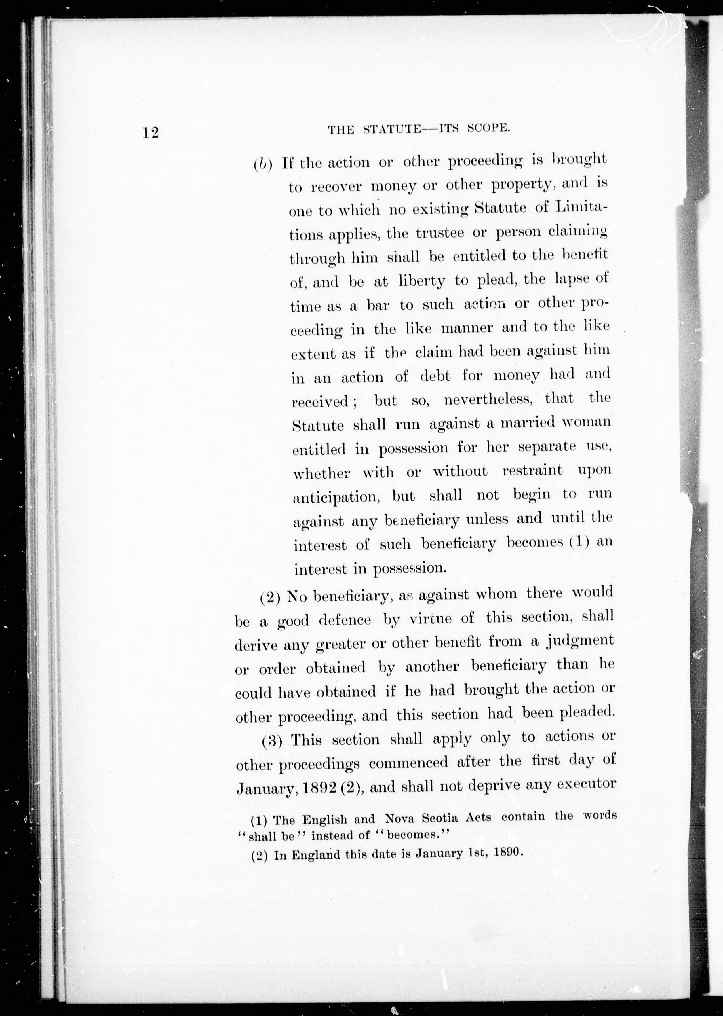 Limitations of actions against trustees and relief from liability for technical breaches of trust : being a concise treatise upon the position of trustees as affected by the Imperial Statute, 51 and 52 Victoriae, cap. 59, section 8, the Revised Statute of Ontario (1897), cap. 129, section 32, The Nova Scotia Statute, 52 Victoriae, cap. 18, section 17, and by the Imperial Statute, 59 and 60 Victoriae, cap. 35, section 3, the Ontario Statute, 62 Victoriae, cap. 15, section 1, the New Brunswick Statute, 61 Victoriae, cap. 26 : with an appendix of statutes, copious references and a very full index - Adresse bibliographique