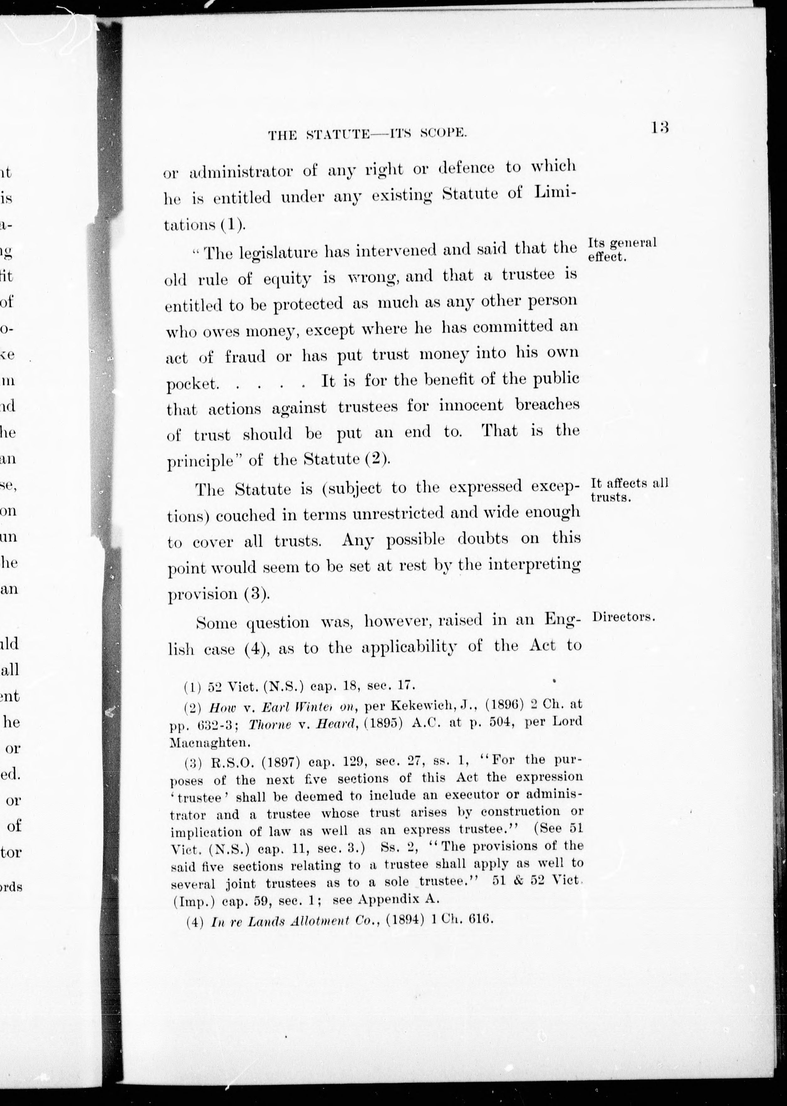 Limitations of actions against trustees and relief from liability for technical breaches of trust : being a concise treatise upon the position of trustees as affected by the Imperial Statute, 51 and 52 Victoriae, cap. 59, section 8, the Revised Statute of Ontario (1897), cap. 129, section 32, The Nova Scotia Statute, 52 Victoriae, cap. 18, section 17, and by the Imperial Statute, 59 and 60 Victoriae, cap. 35, section 3, the Ontario Statute, 62 Victoriae, cap. 15, section 1, the New Brunswick Statute, 61 Victoriae, cap. 26 : with an appendix of statutes, copious references and a very full index
