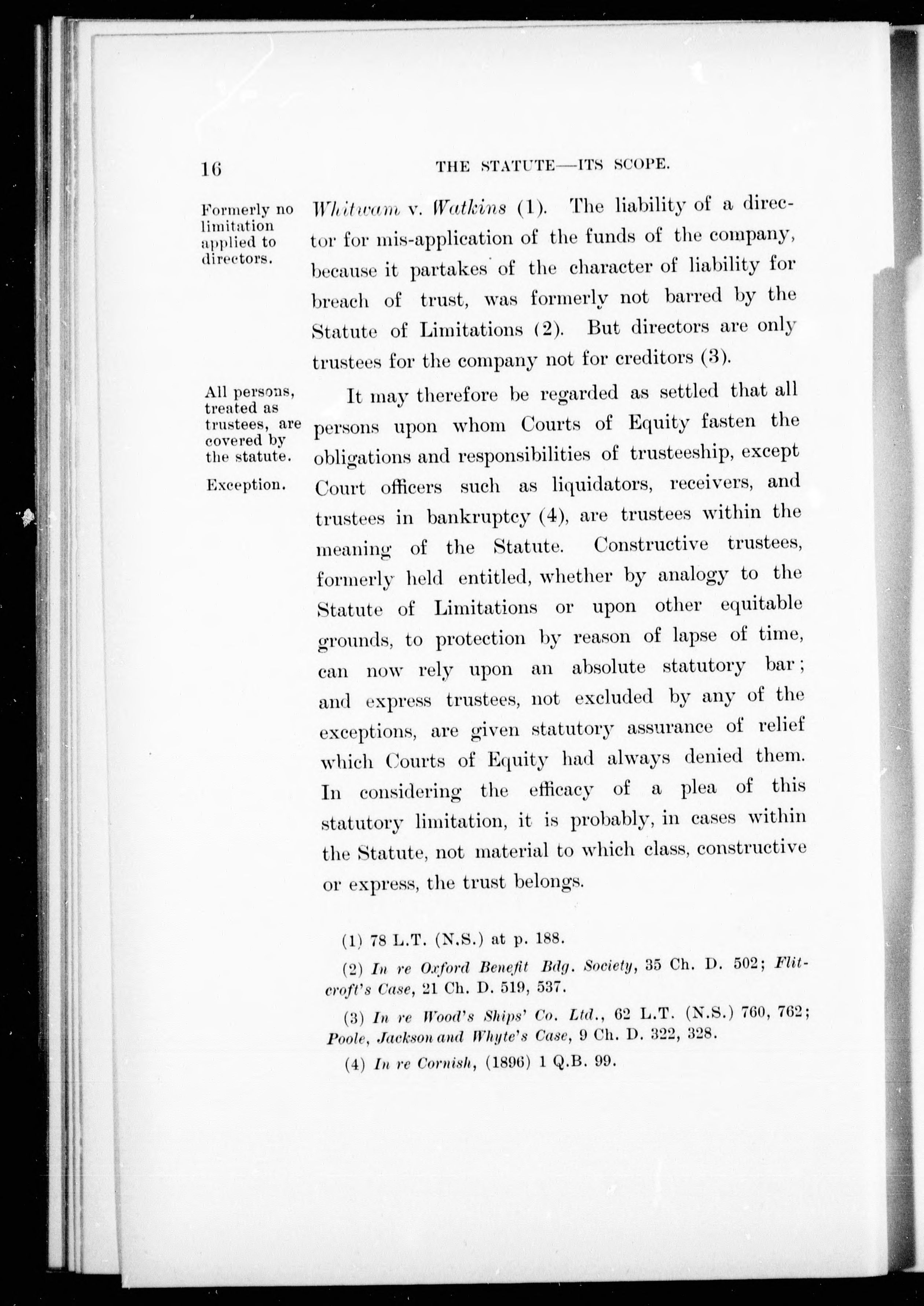 Limitations of actions against trustees and relief from liability for technical breaches of trust : being a concise treatise upon the position of trustees as affected by the Imperial Statute, 51 and 52 Victoriae, cap. 59, section 8, the Revised Statute of Ontario (1897), cap. 129, section 32, The Nova Scotia Statute, 52 Victoriae, cap. 18, section 17, and by the Imperial Statute, 59 and 60 Victoriae, cap. 35, section 3, the Ontario Statute, 62 Victoriae, cap. 15, section 1, the New Brunswick Statute, 61 Victoriae, cap. 26 : with an appendix of statutes, copious references and a very full index