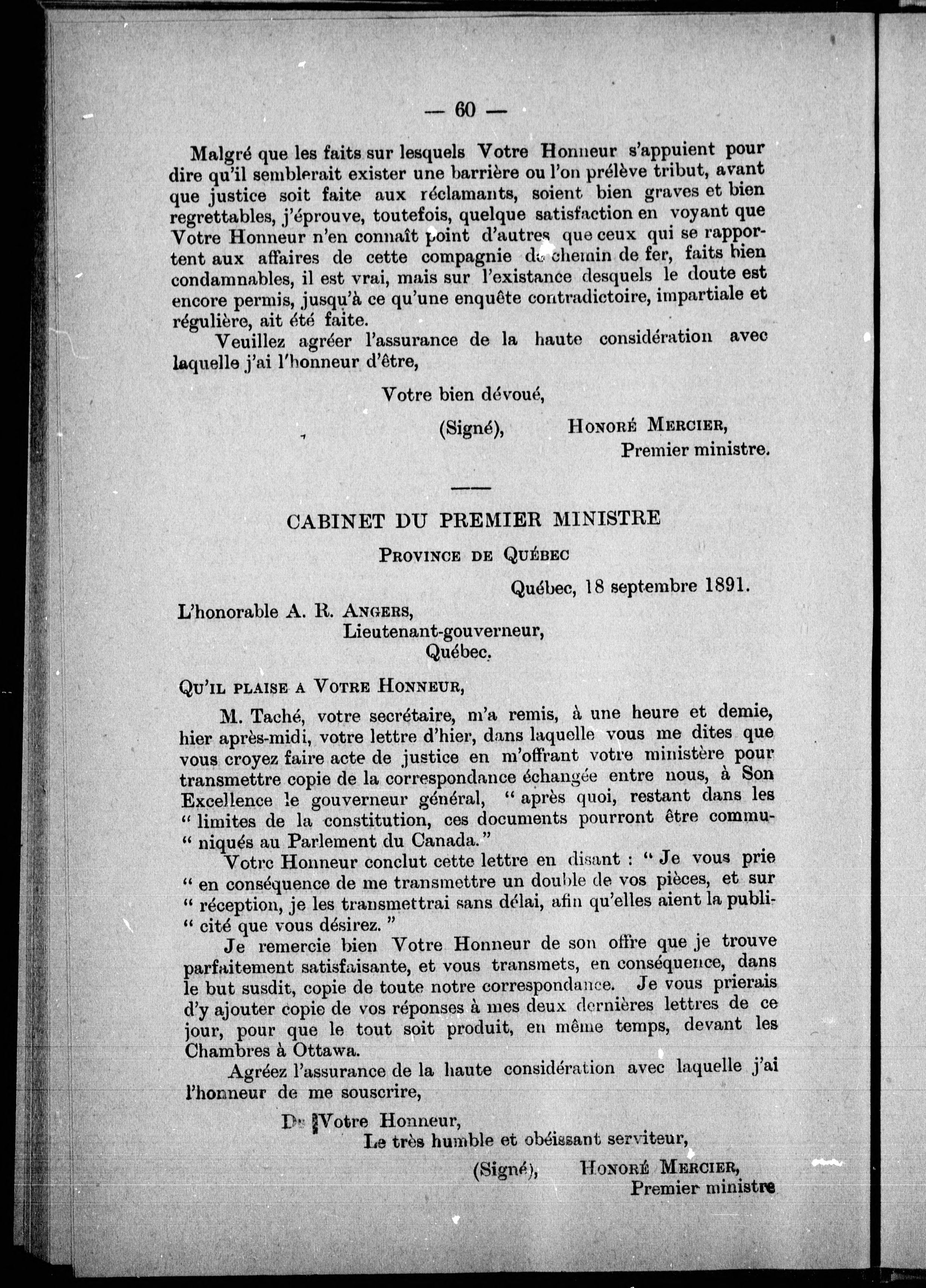 Chemin de fers de la Baie des Chaleurs : dossier officiel complet : correspondance officielle entre Son Honneur le Lieutenant-Gouverneur et M. Mercier, Premier Ministre. - Adresse bibliographique