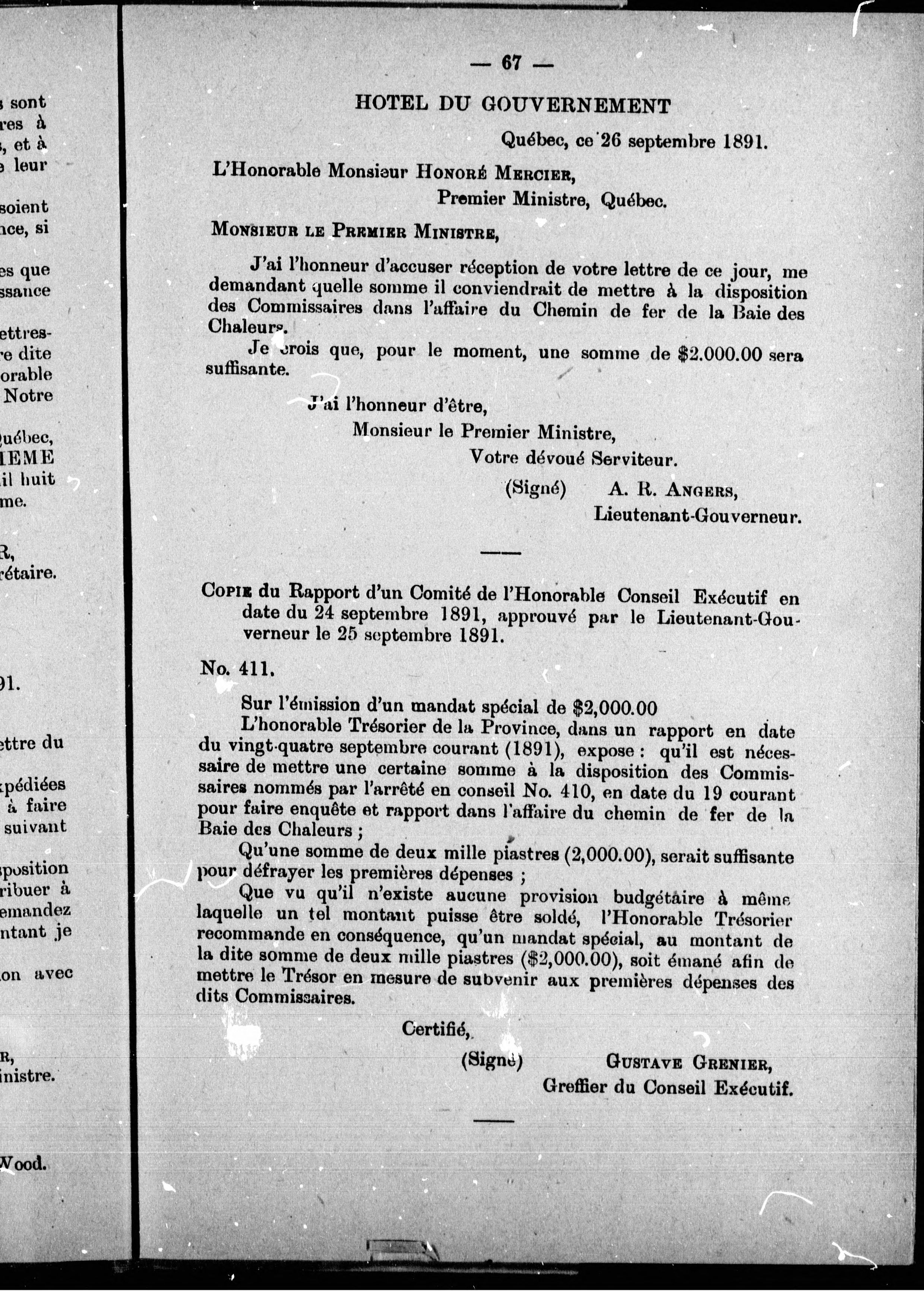 Chemin de fers de la Baie des Chaleurs : dossier officiel complet : correspondance officielle entre Son Honneur le Lieutenant-Gouverneur et M. Mercier, Premier Ministre. - Adresse bibliographique
