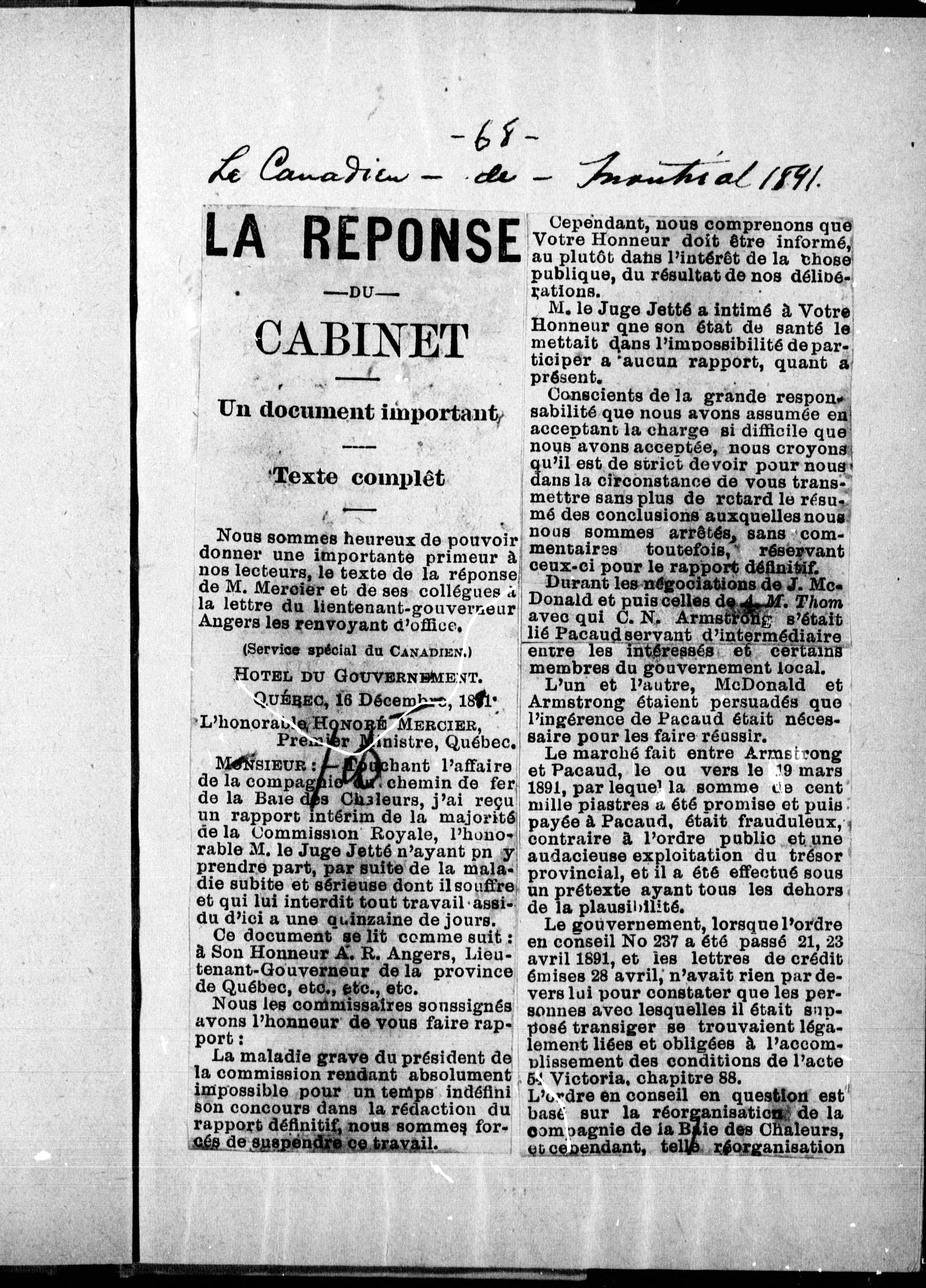 Chemin de fers de la Baie des Chaleurs : dossier officiel complet : correspondance officielle entre Son Honneur le Lieutenant-Gouverneur et M. Mercier, Premier Ministre. - Adresse bibliographique